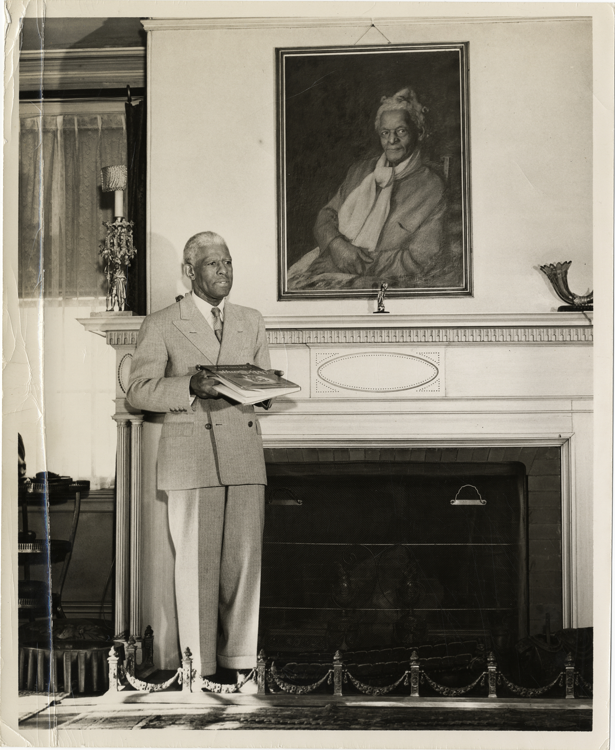 View of tenor Roland Hayes, posing in front of fireplace with a copy of his book, "My Songs." Portrait of his mother, Fannie Hayes, is displayed over fireplace mantel.