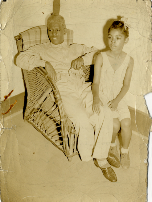 View of tenor Roland Hayes posing on chair with his daughter, Afrika. Undecipherable handwriting on back.