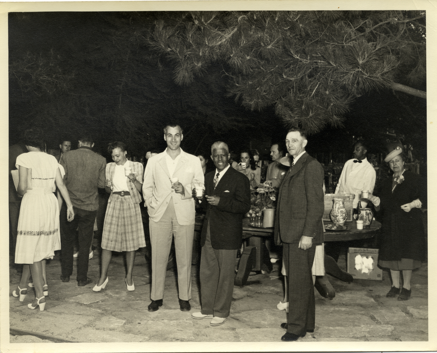 View of tenor Roland Hayes posing outdoors with two unidentified men at a party. Men and women in background; waiter stands behind table.