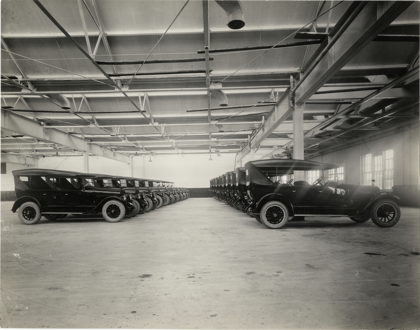 View of Lincoln touring cars lined up in garage. Handwritten on back: "Lincoln, 1920-22."