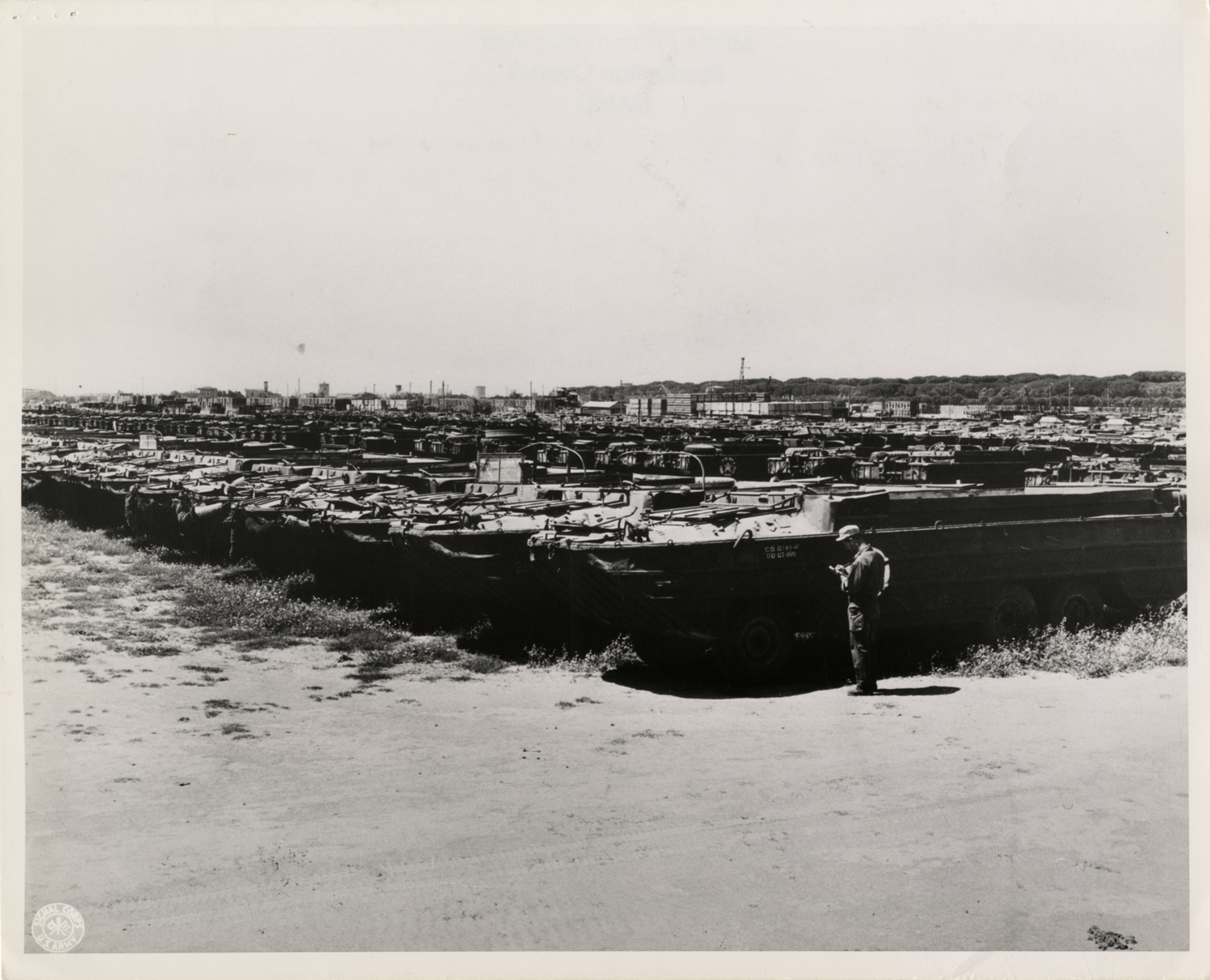 Amphibious trucks awaiting processing for reshipment, Livorno, Italy