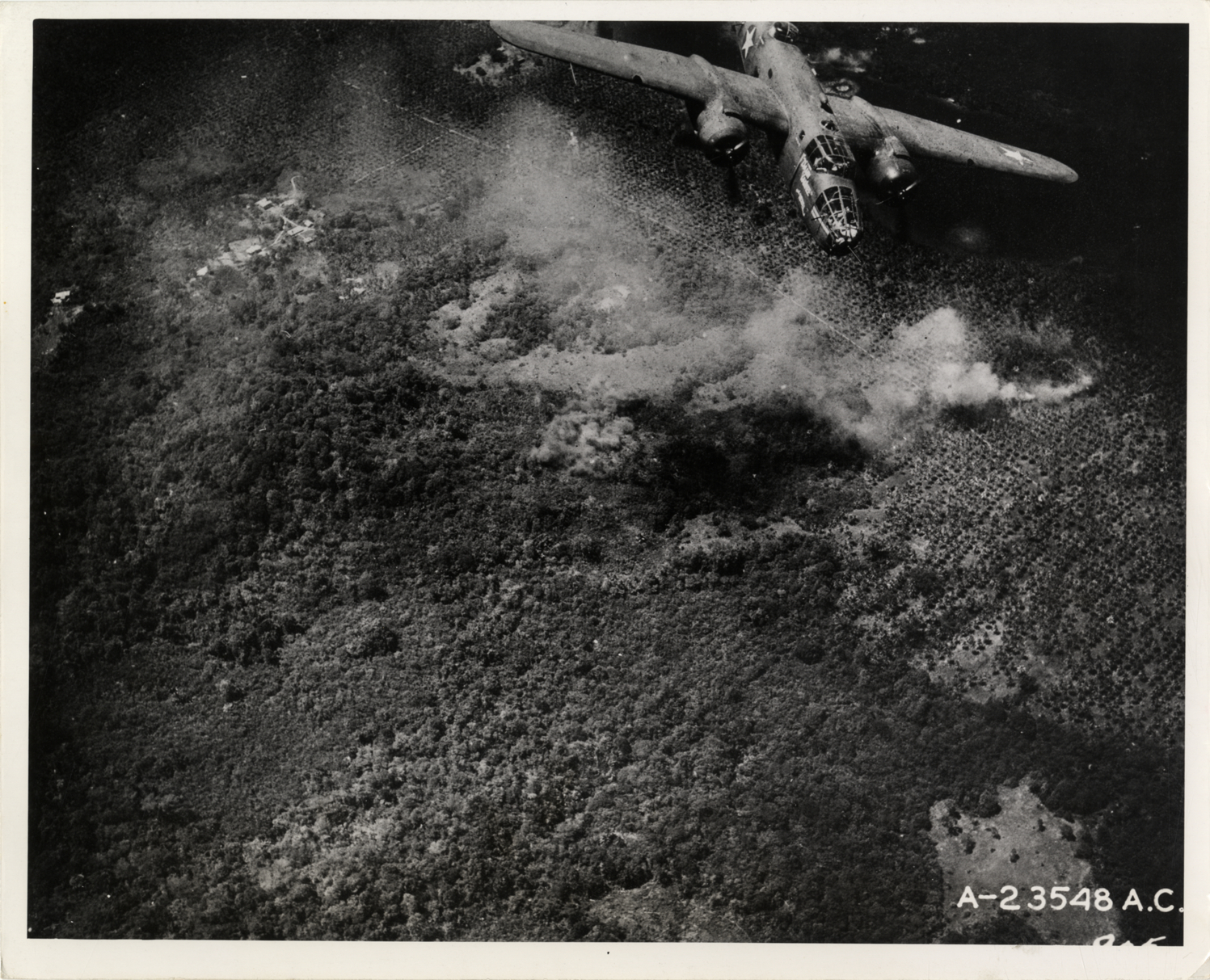 View of Mitchell B-25 bomber dropping bombs on Japanese military installations at Finschhafen, Papua New Guinea during World War II. Stamped on back: "Released for publication. Credit, official photo U.S. Air Forces." Handwritten on back: "An American B-25 bomber drops bombs on Japanese military installations around Finschhafen harbor. Smoke from the bombs is seen across the upper area. Aircraft in action."
