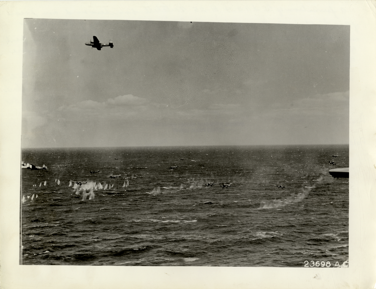 View of Mitchell B-25 bombers escorted by P-38 Lightning fighter planes over Strait of Sicily during World War II. Stamped on back: "Released for publication. Credit: Official photo U.S. Air Forces." Handwritten on back: "A formation of U.S.A.A.F. B-25 Mitchell bombers and an escort of P-38 Lightnings engaged on an Axis air convoy of 35 planes over the Sicilian Straits recently. This picture taken during part of the action shows Axis planes being riddled by machine gun fire during the attack. Three American planes are shown. The one at the extreme left flying low has just completed attack action while another B-25 is shown overhead at the left. 12 Axis air transports almost at water level are under attack in this view. Wing of 3rd plane is at extreme right. Aircraft in action."