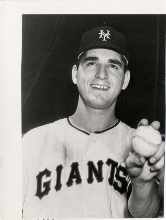 View of Johnny Antonelli, pitcher for the San Francisco Giants, holding a baseball. Handwritten on back: "John Antonelli, B.B. One of 2 top pitchers, 1954."