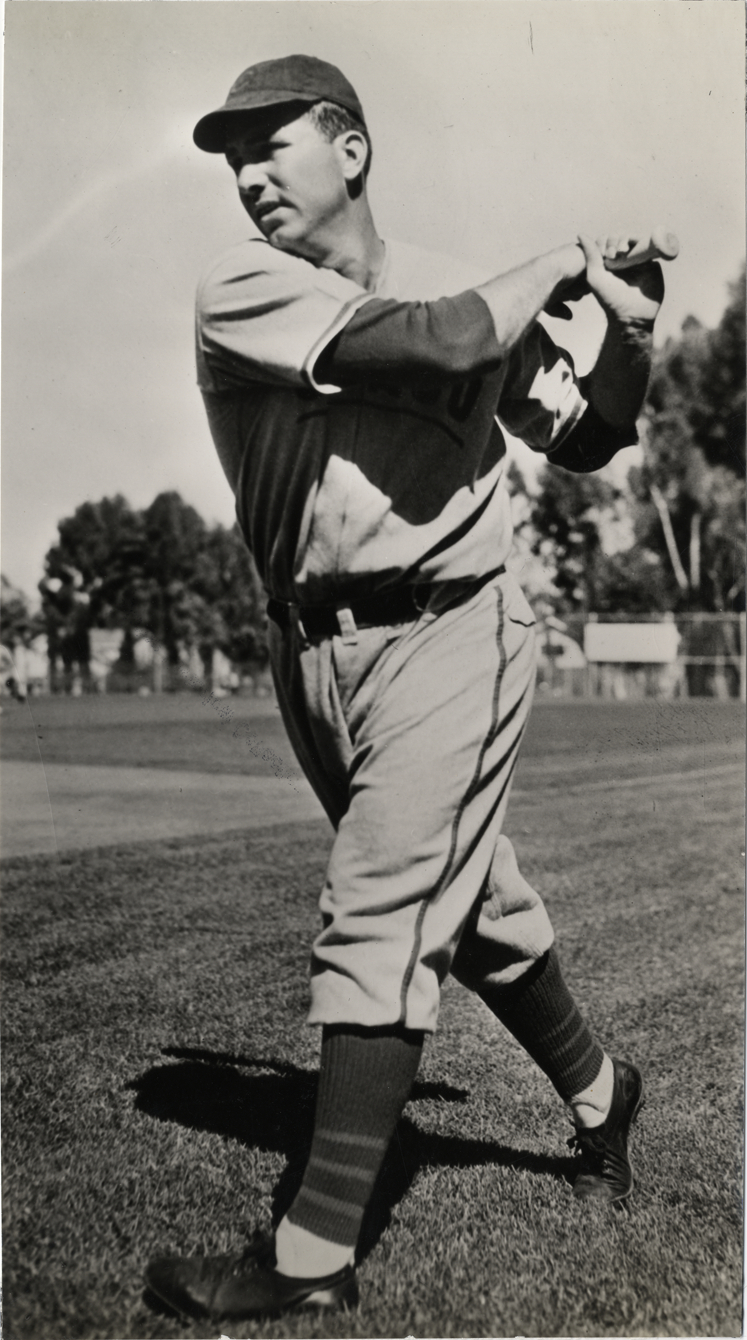 View of Jim Asbell, baseball player for the Chicago Cubs, swinging a baseball bat. Handwritten on back: "Jim Asbell."