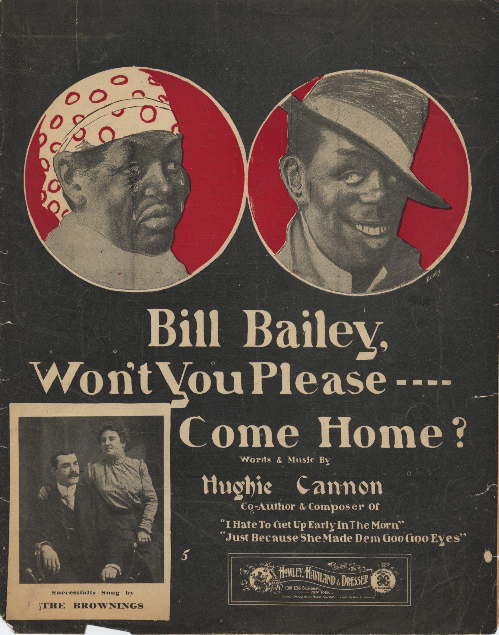 Bill Bailey, won't you please come home? / words and music by Hughie Cannon. For voice and piano. Caption title. First line of text: On one summer's day, sun was shining fine. First line of chorus: Won't you come home, Bill Bailey.