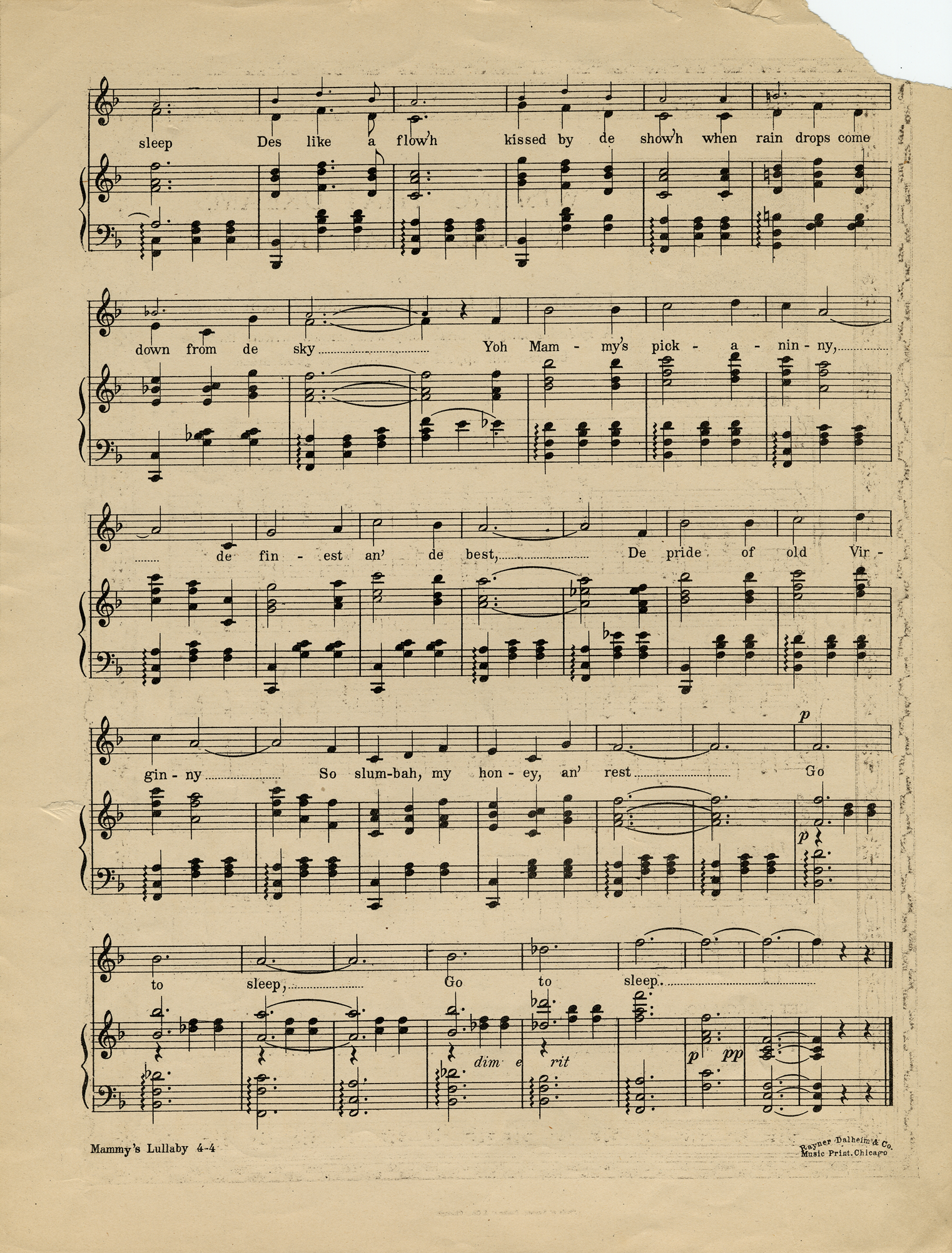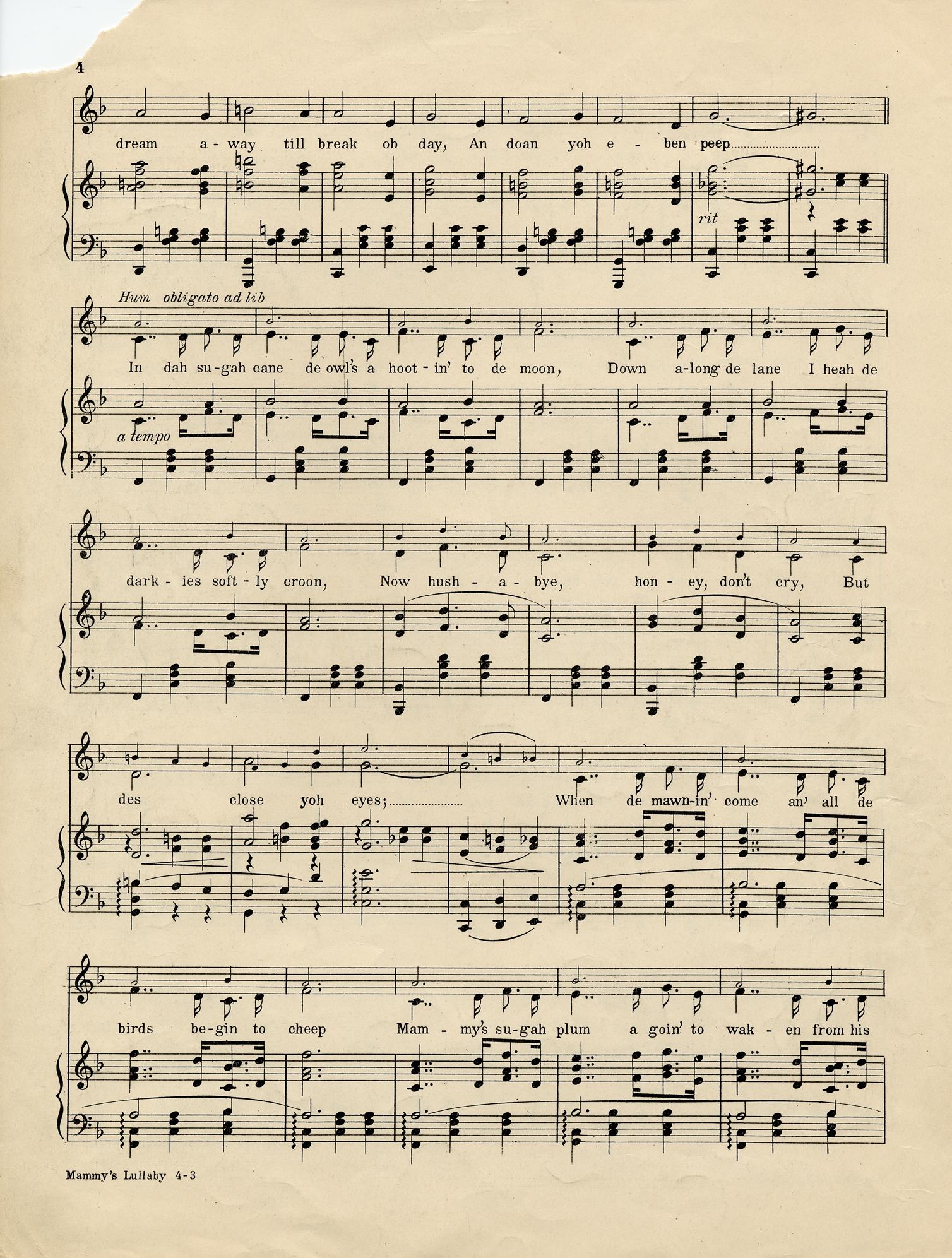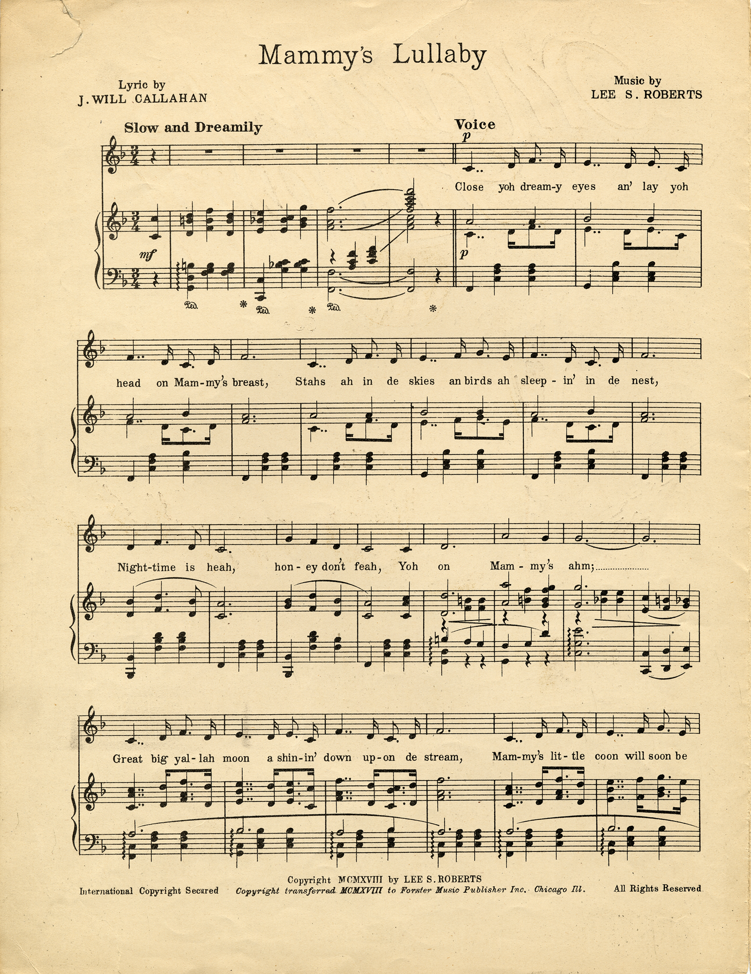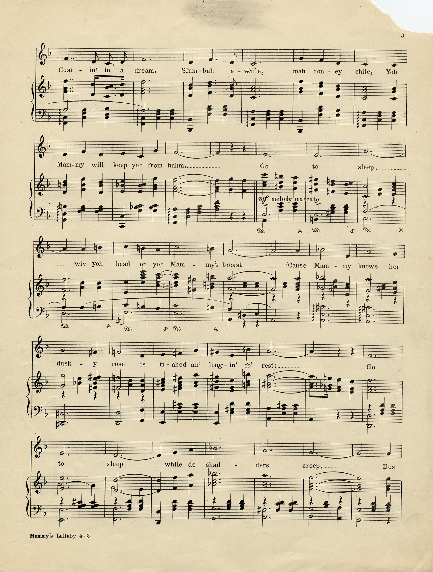 First line of text: Close yoh dreamy eyes an' lay yoh head on Mammy's breast.