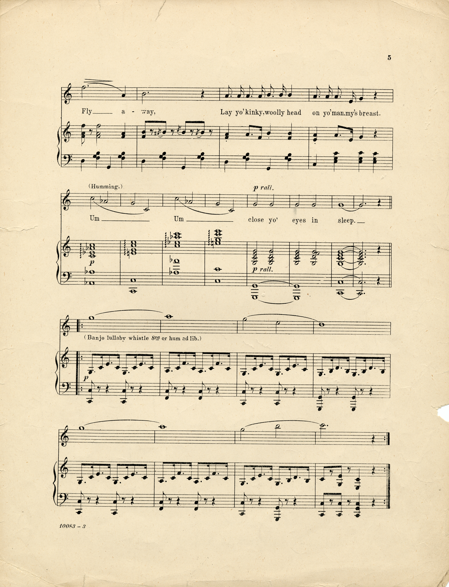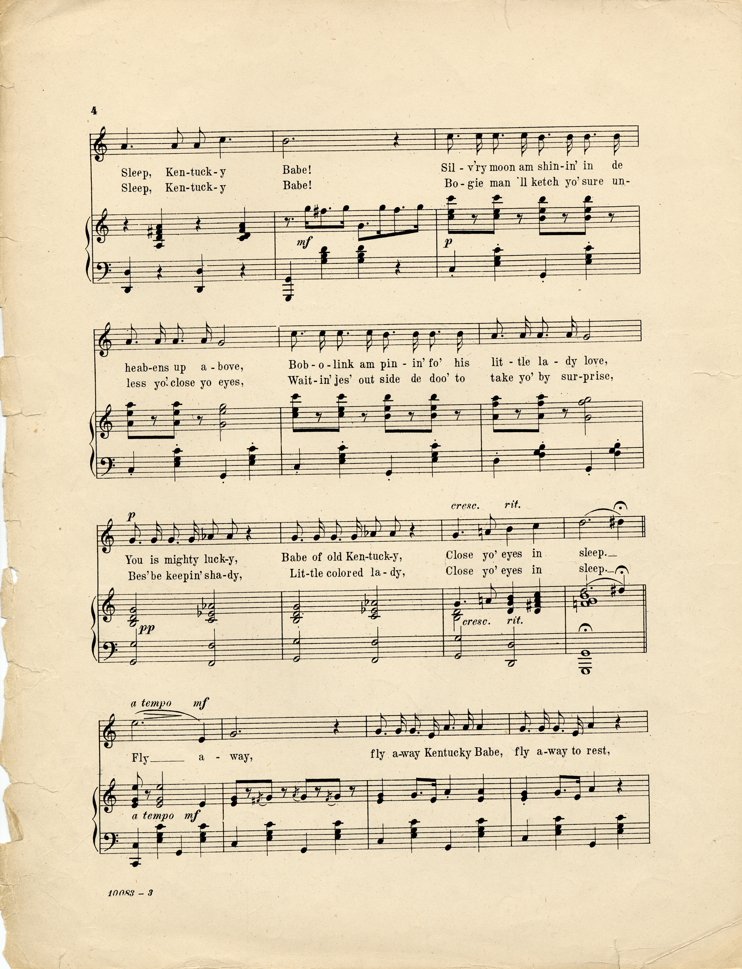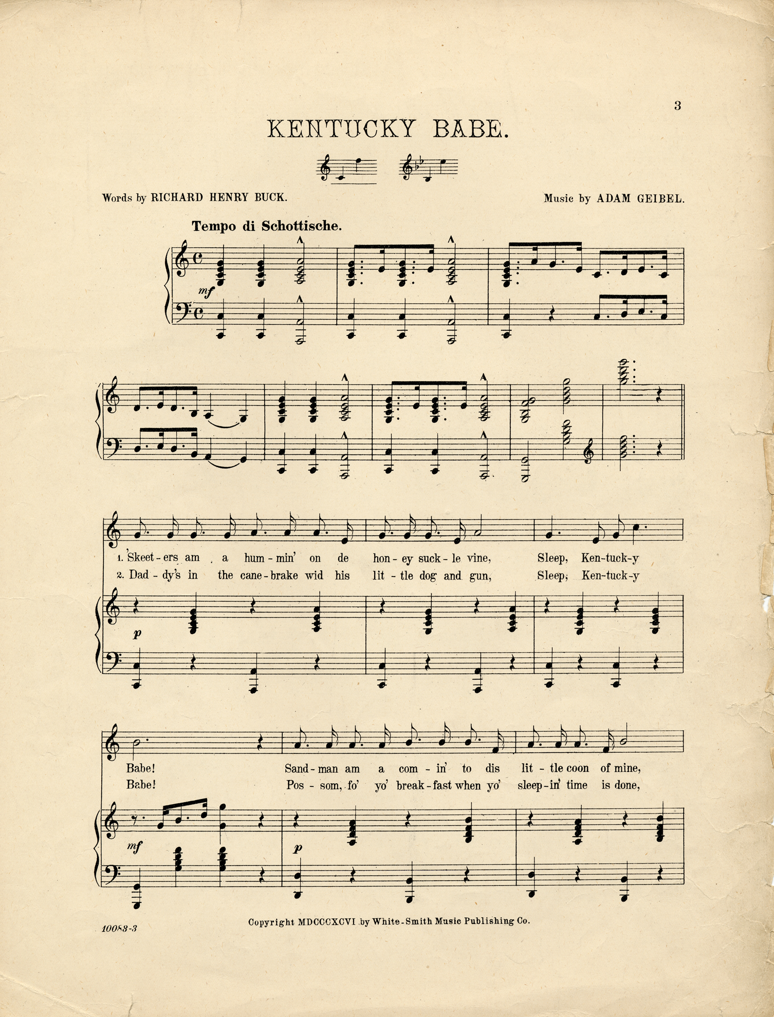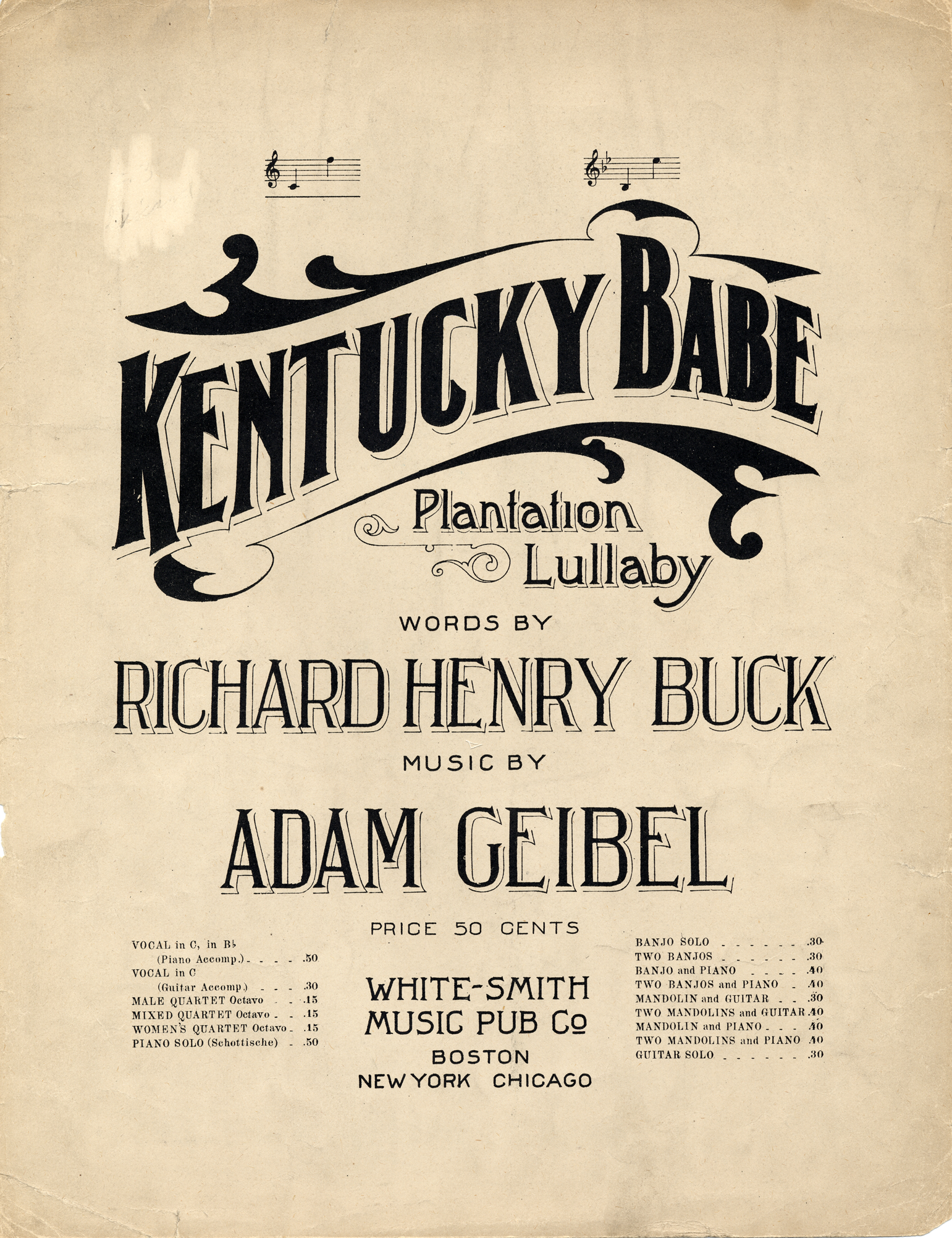 Kentucky babe : a plantation lullaby / words by Richard Henry Buck ; music by Adam Geibel. Cover title. First line of text: 'Skeeters am a hummin' on de honey suckle vine. First line of chorus: Fly away. For voice and piano. Pl. no.: 10083-3.