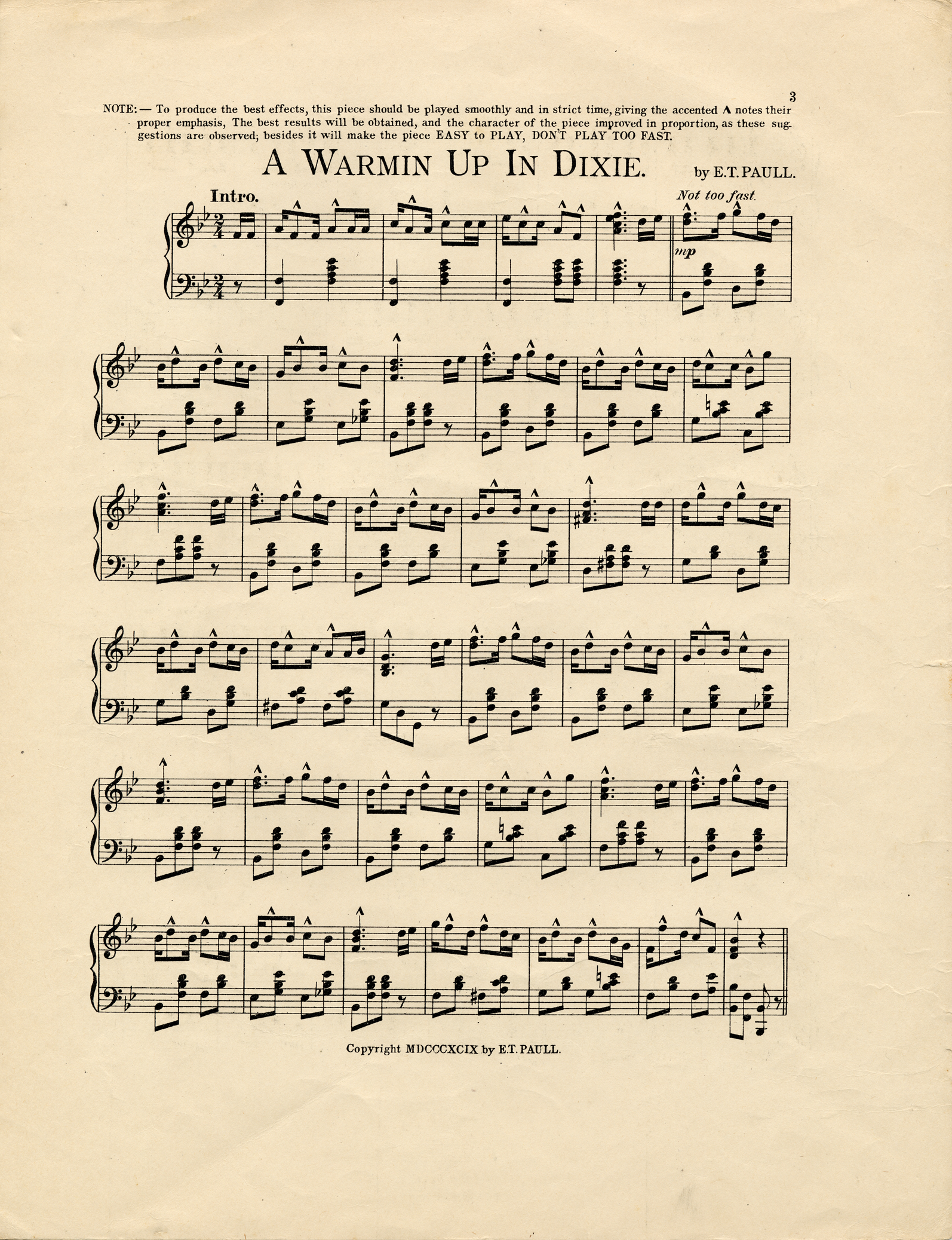 A warmin' up in Dixie : cake walk, march and two step / by E. T. Paull. For piano solo. Cover title. Cover ill. : Slaves dancing around campfire at night.