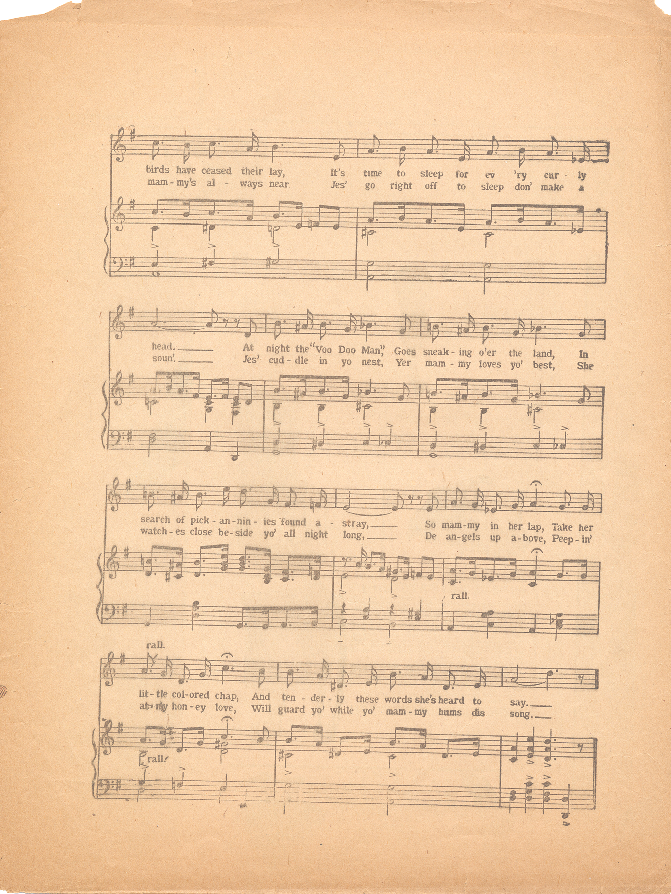 Sleep ma honey : lullaby / by Will Livernash. For voice and piano. Cover title. First line of text: Sandman's blown his horn. First line of chorus: Sleep, sleep, rest ma honey chile.