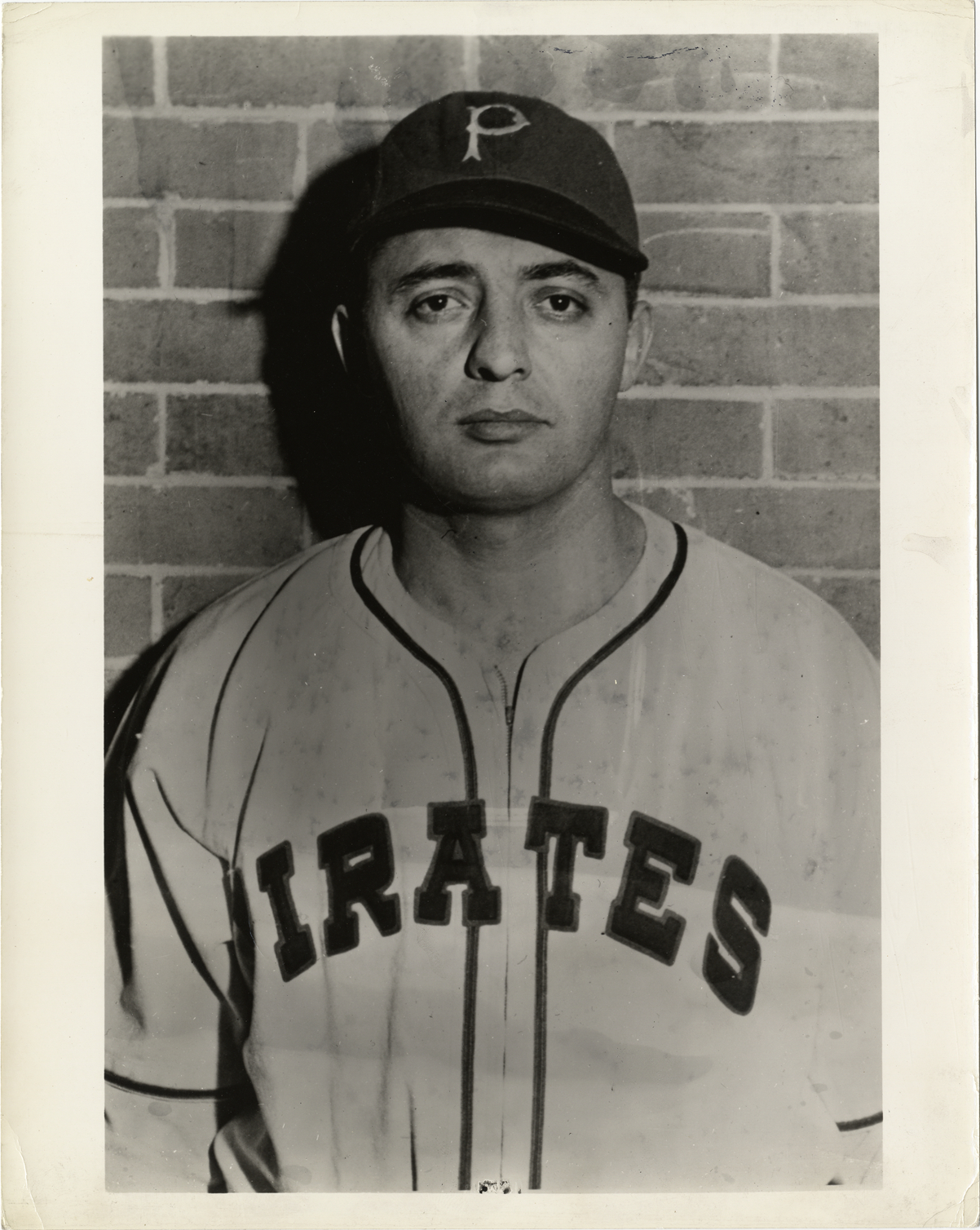 Portrait of Hank Camelli, catcher for the Pittsburgh Pirates. Typed on back: "Catcher Hank Camelli, Pittsburgh Pirates."
