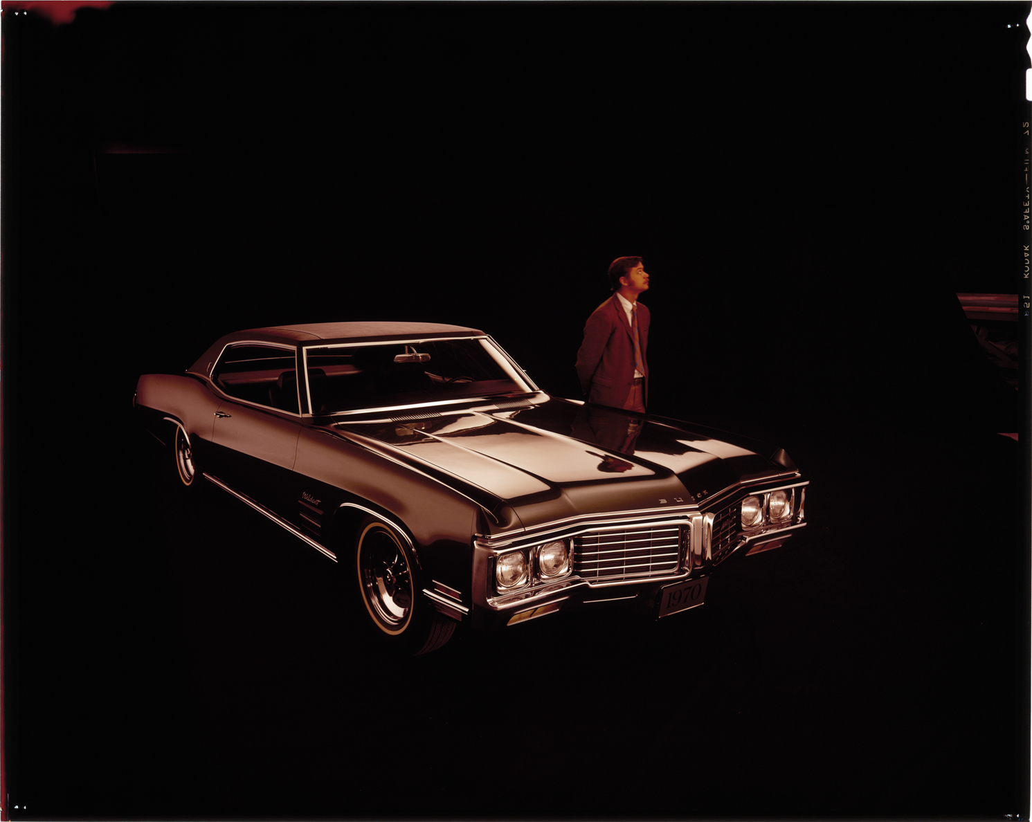 View of man posing with a 1970 Buick Wildcat coupe. Label on sleeve: "General Motors, Buick Wildcat, 1970."