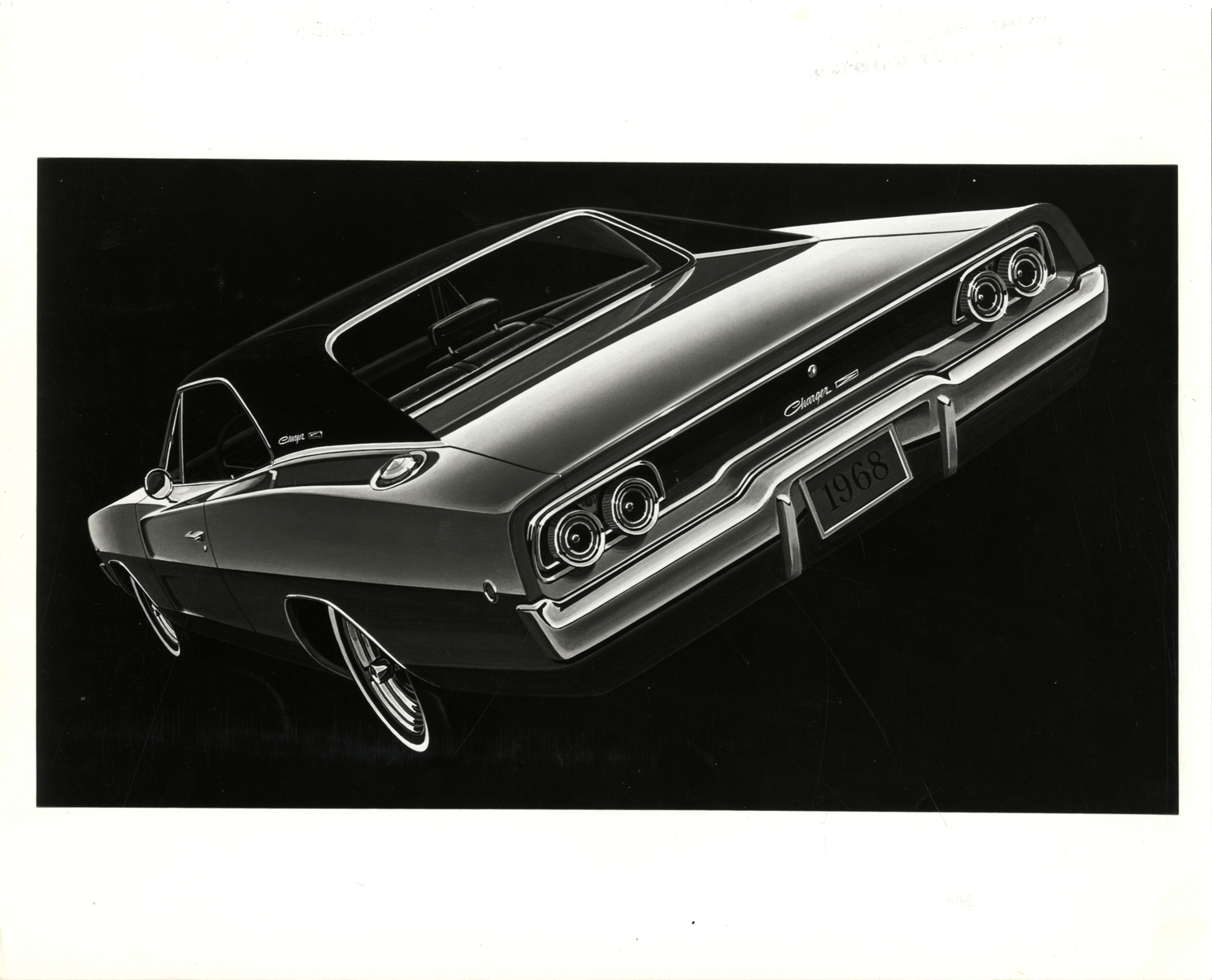 Artist's depiction of a 1968 Dodge Charger coupe.