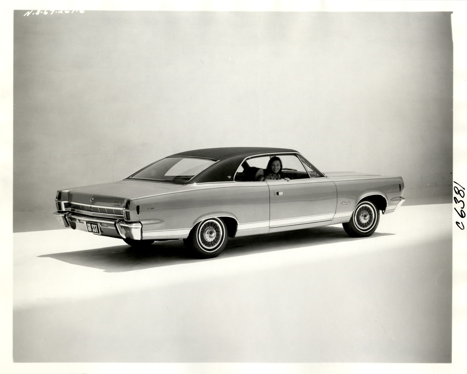 View of woman posing in a 1968 AMC Ambassador SST coupe. Handwritten on back: "Ambassador SST, 2 door hardtop."