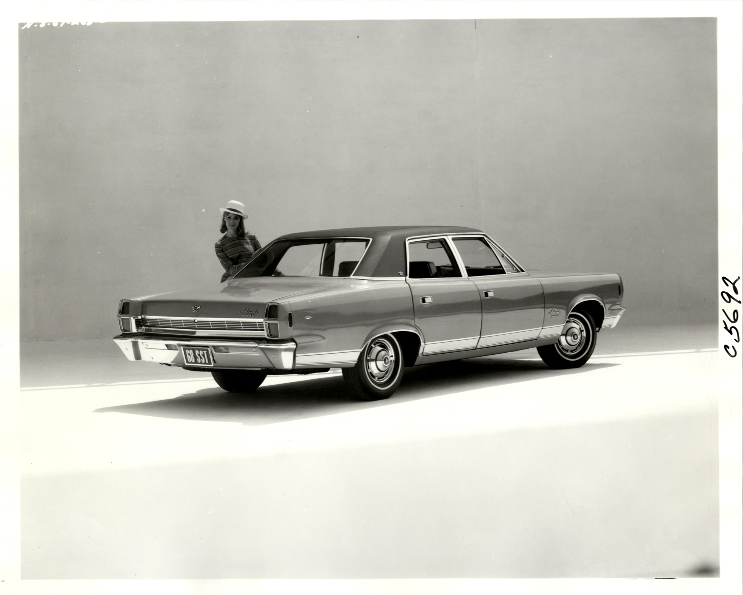 View of woman posing with a 1968 AMC Ambassador SST sedan. Handwritten on back: "Ambassador, 4 door sedan."