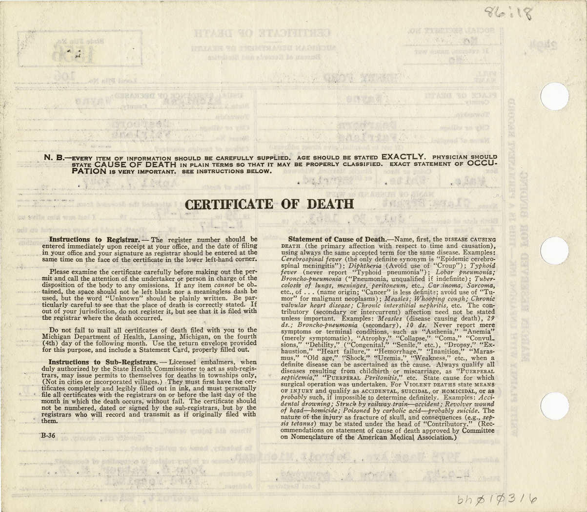 View of death certificate for Henry Ford, issued by the Michigan Department of Health, Bureau of Records and Statistics.