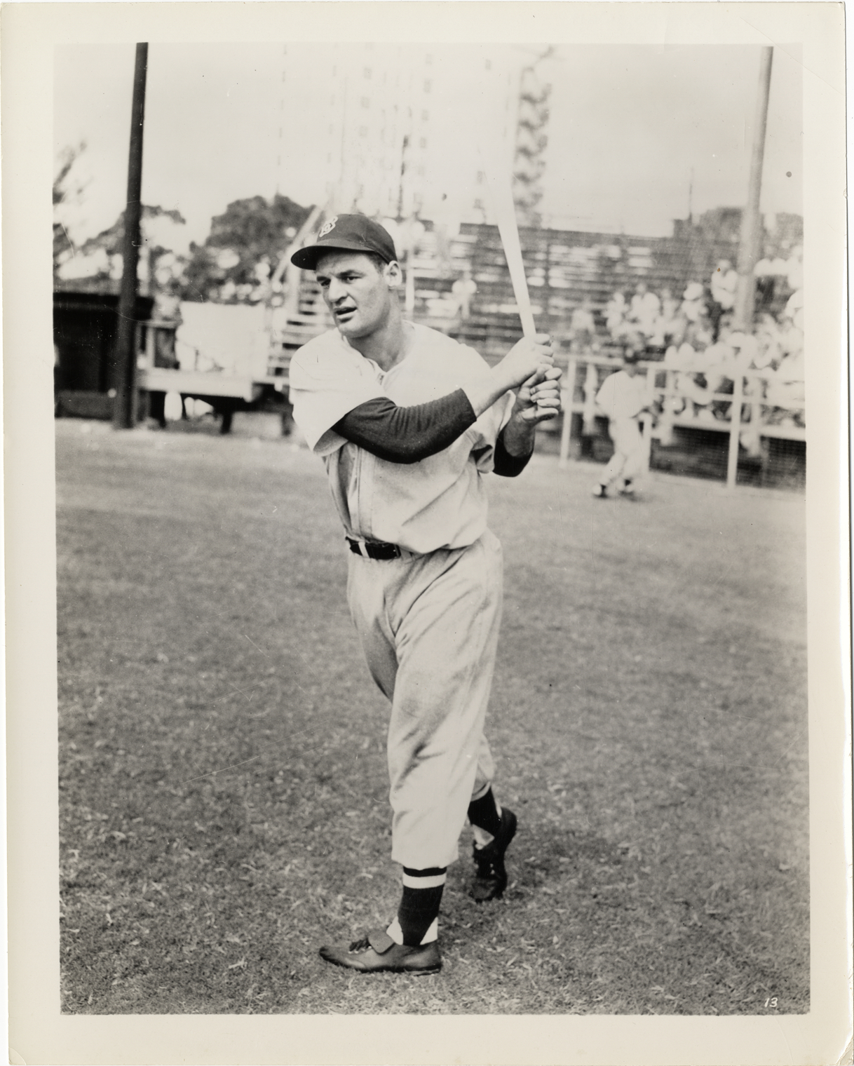 View of Walt Dropo, baseball player for the Boston Red Sox, holding a baseball bat. Handwritten on back: "Walt Dropo."