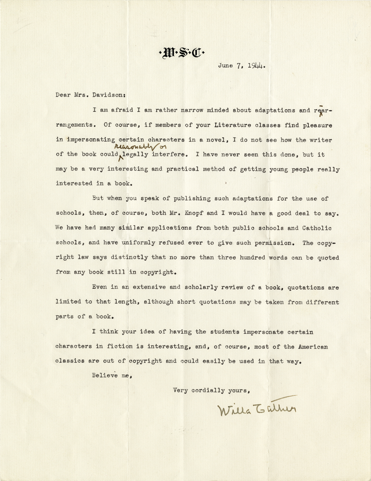 Summary: Ms. Cather states that she could not "reasonably or legally interfere" with Mrs. Davidson's literature class "impersonating certain characters in a novel" as a "method of getting young people really interested in a book." But publication of such adaptations would violate copyright laws, and both she and Mr. Knopf "have uniformly refused ever to give such permission."
