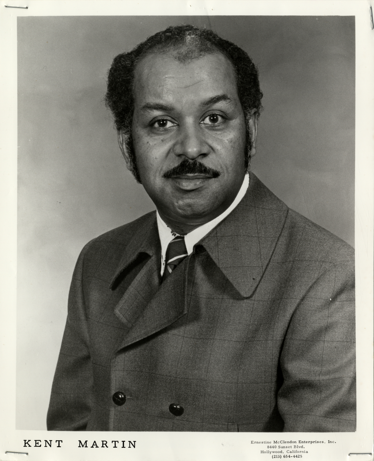 Portrait of actor Kent Martin. Printed on front: "Kent Martin. Ernestine McClendon Enterprises, Inc. 8440 Sunset Blvd., Hollywood, California. (213) 654-4425." Resume attached to back of photograph.