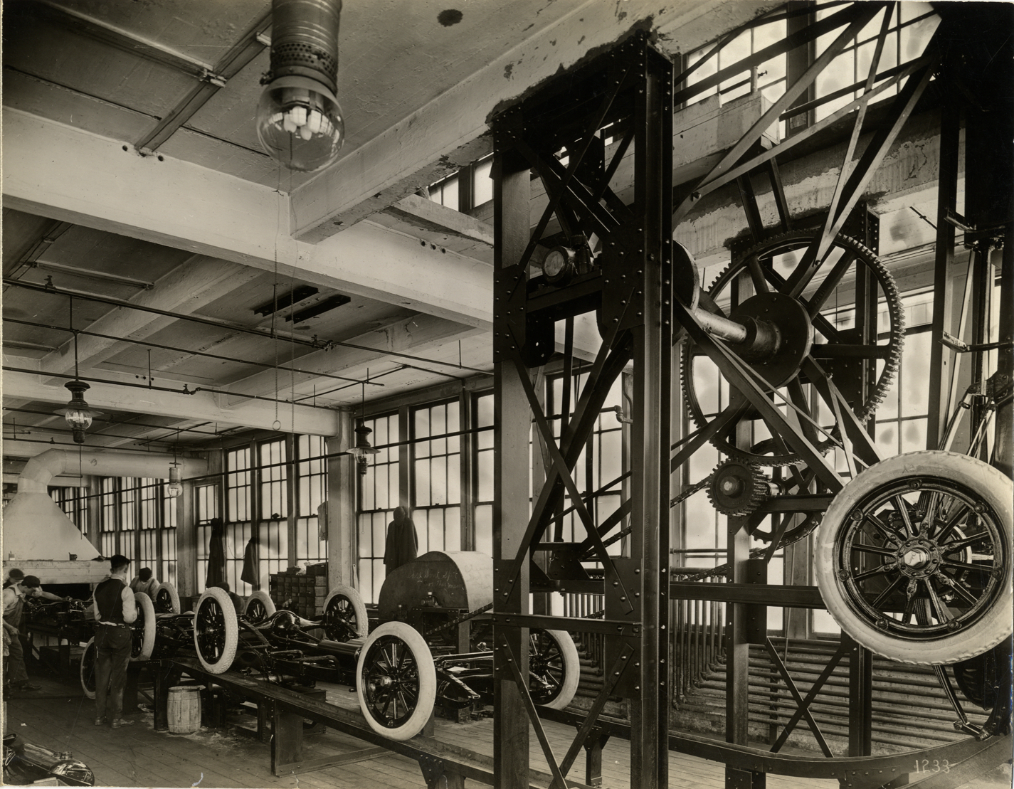 Automobile chassis on elevating conveyor, Chalmers Motor Company factory