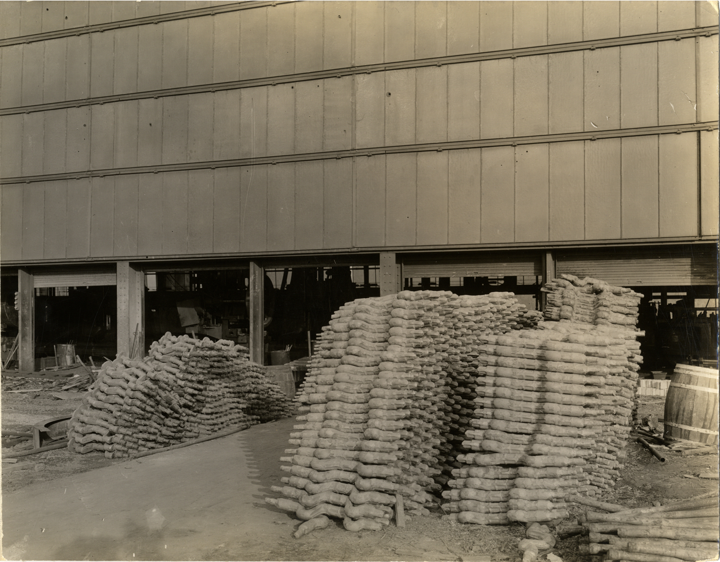 Automobile parts stacked in front of Chalmers Motor Company factory