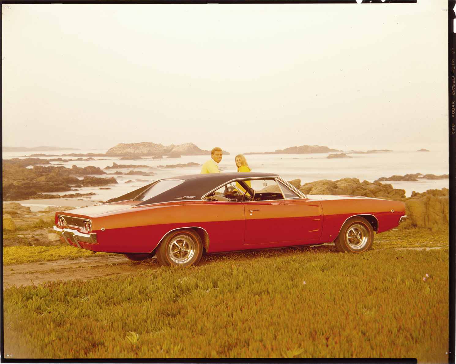 View of a man and woman posing with a 1968 Dodge Charger coupe on shoreline. Label on sleeve: "Chrysler Corporation, Dodge Charger, 1968."