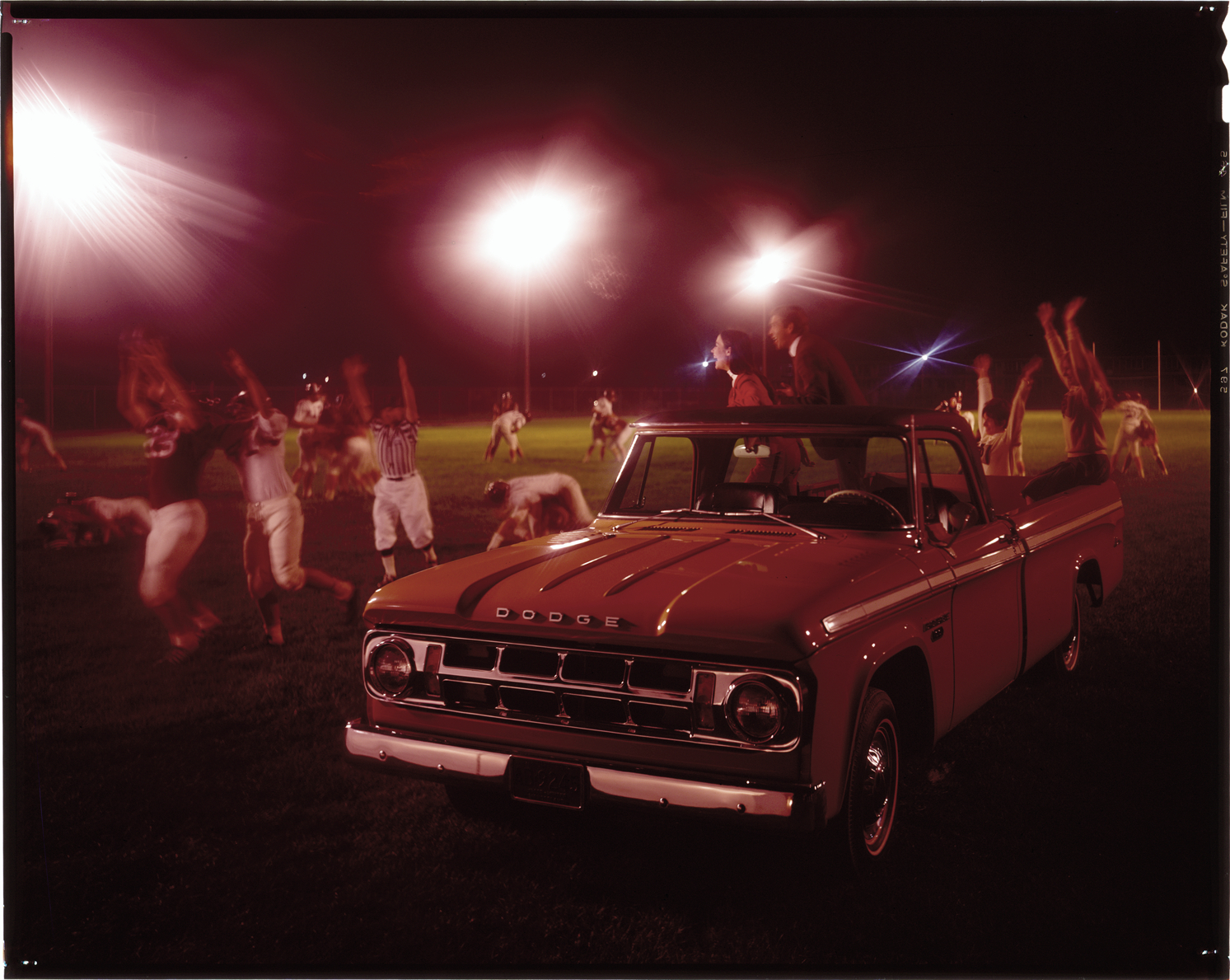 View of a man and woman posing in a 1968 Dodge pickup truck at a football game. Label on sleeve: "Chrysler Corporation, Dodge pickup truck, 1968."