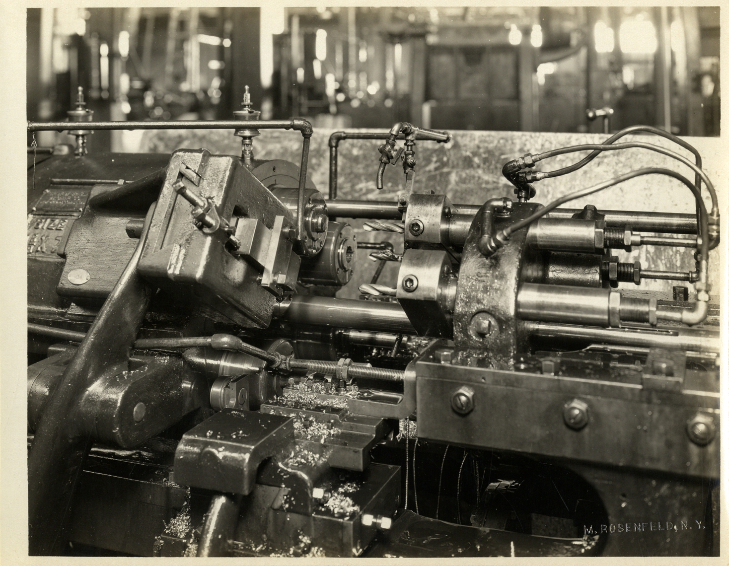 Close-up view of a lathe at the Duesenberg Motor Company factory. Embossed on front: "M. Rosenfeld, N.Y." Handwritten on back: "Factories--Duesenberg."
