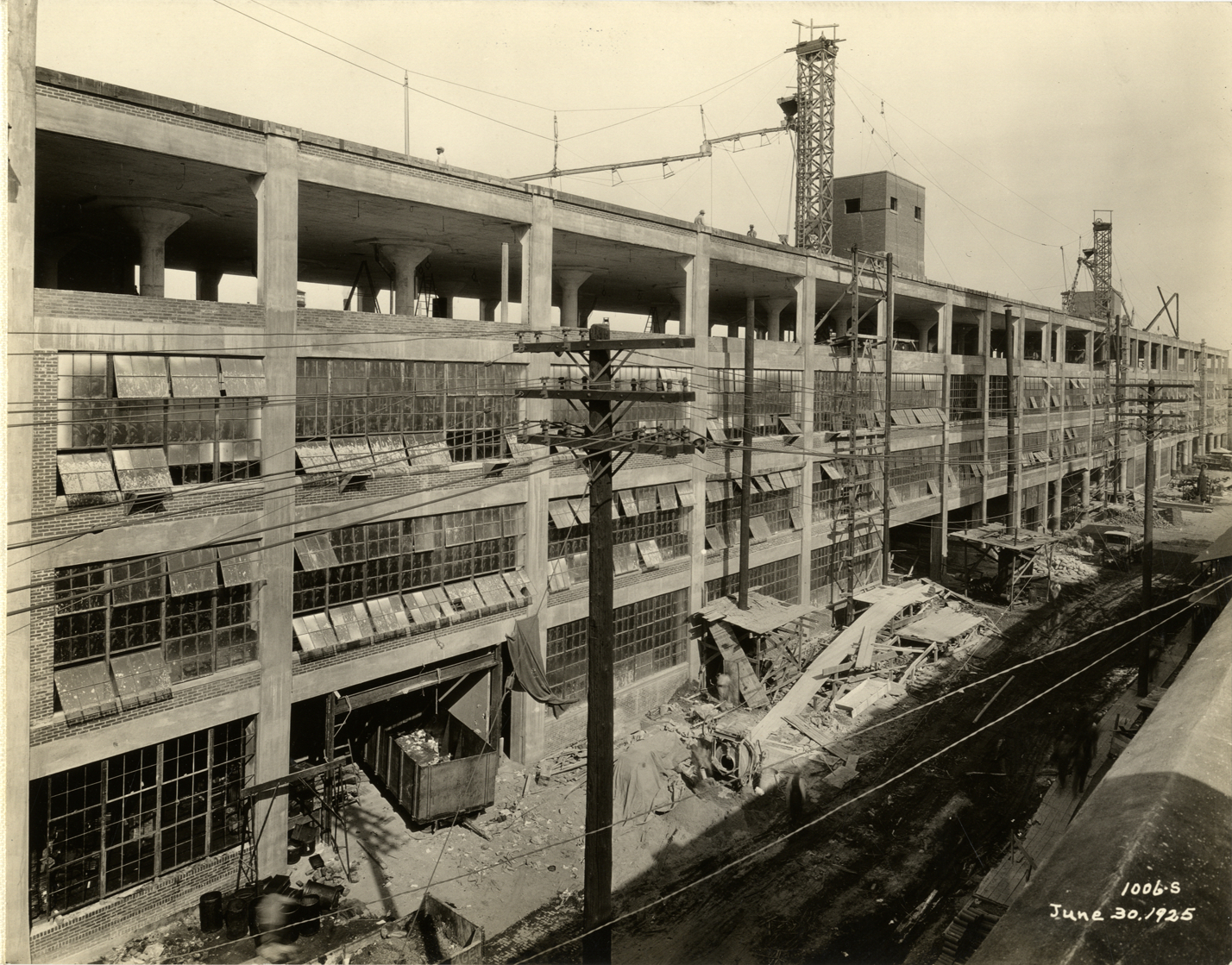 View of the Hudson Motor Car Company factory during construction. Printed on front: "1006-S. June 30, 1925." Handwritten on back: "New Conners [sic] Ave. bldg. under construction. Factories--Hudson."