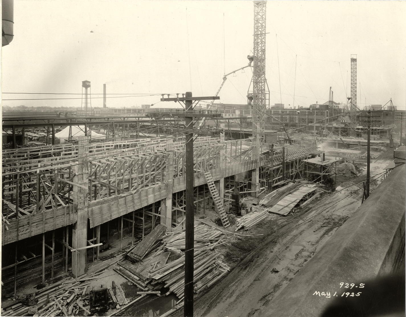 View of the Hudson Motor Car Company factory during construction. Printed on front: "929-S. May 1, 1925." Stamped on back: "Frank H. Stone, commercial photographer. Hickory 5131, 3449 Garland, Detroit, Michigan." Handwritten on back: "5-1-25. Showing new Connors [sic] Ave. bldg. under construction. Factories--Hudson."