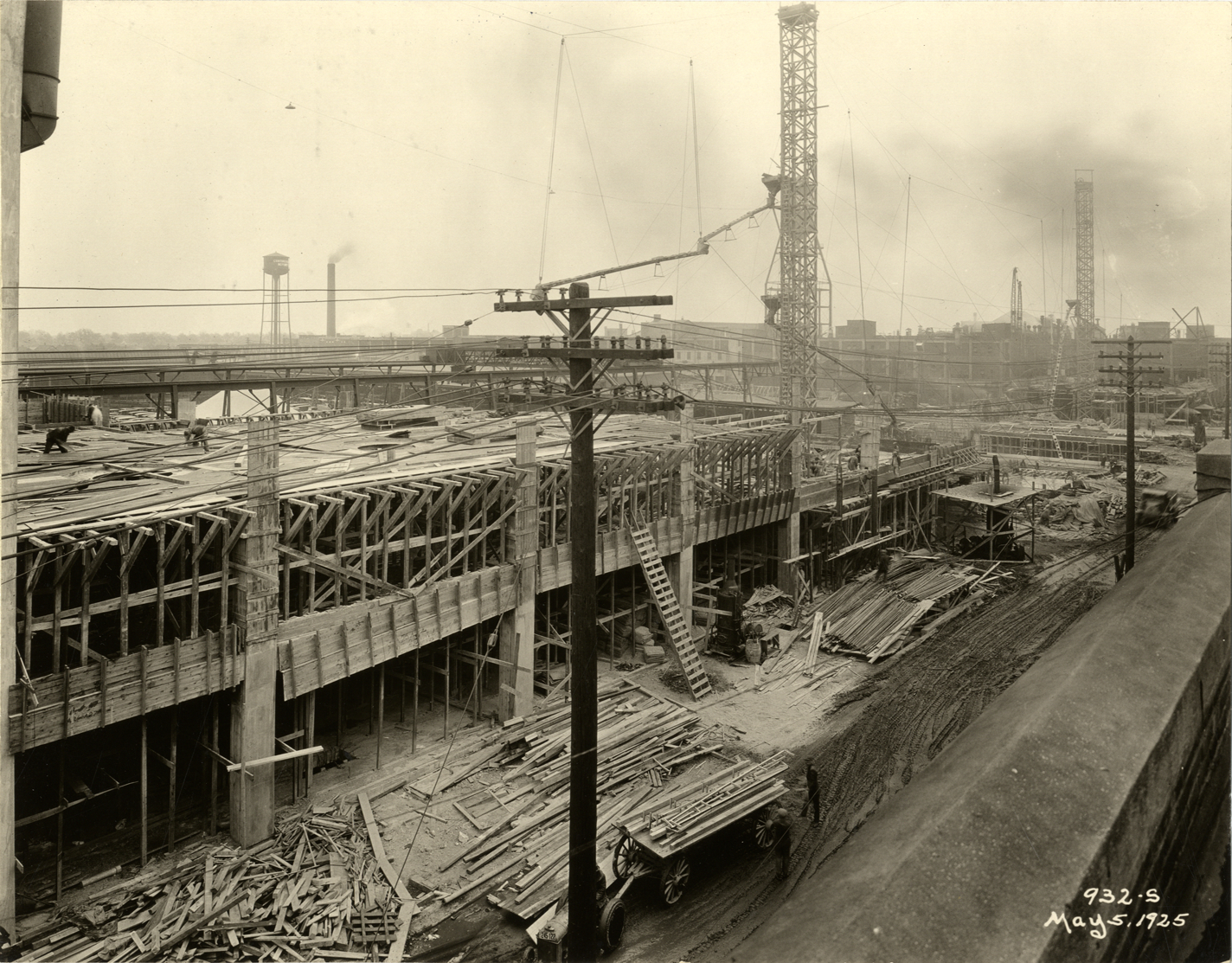 View of the Hudson Motor Car Company factory during construction, showing structural framework. Printed on front: "932-S. May 5, 1925." Stamped on back: "Frank H. Stone, commercial photographer. Hickory 5131, 3449 Garland, Detroit, Michigan." Handwritten on back: "May 5/25. Showing new Connors [sic] Ave. bldg. under construction. Factories--Hudson."