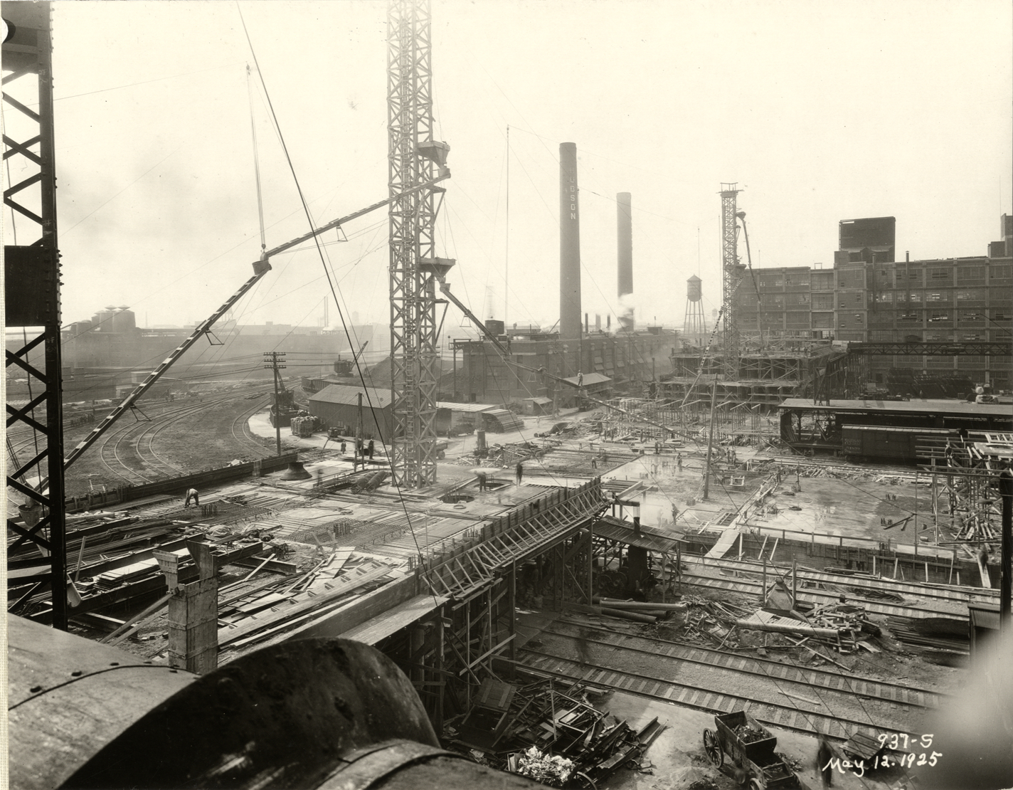 View of the Hudson Motor Car Company factory during construction. Printed on front: "937-S. May 12, 1925." Stamped on back: "Frank H. Stone, commercial photographer. Hickory 5131, 3449 Garland, Detroit, Michigan." Handwritten on back: "May 12/25. Showing new Connors [sic] Ave. bldg. under construction. Factories--Hudson."