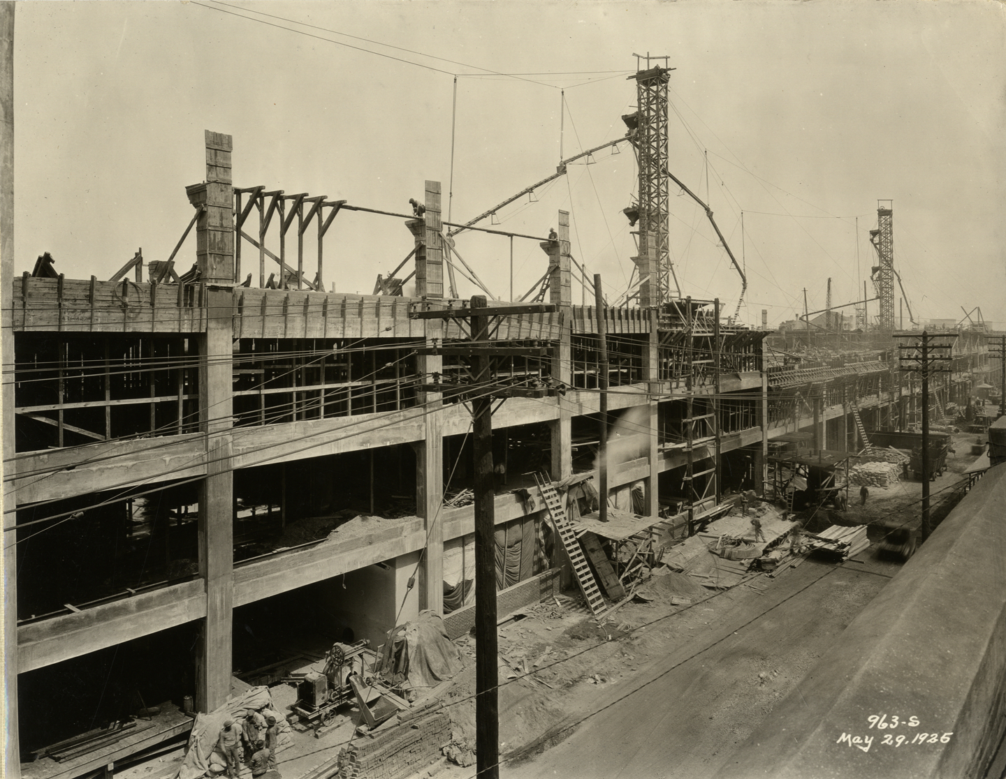 View of the Hudson Motor Car Company factory during construction. Printed on front: "963-S. May 29, 1925." Handwritten on back: "May 29/25. Showing new Connors [sic] Ave. bldg. under construction. Factories--Hudson."