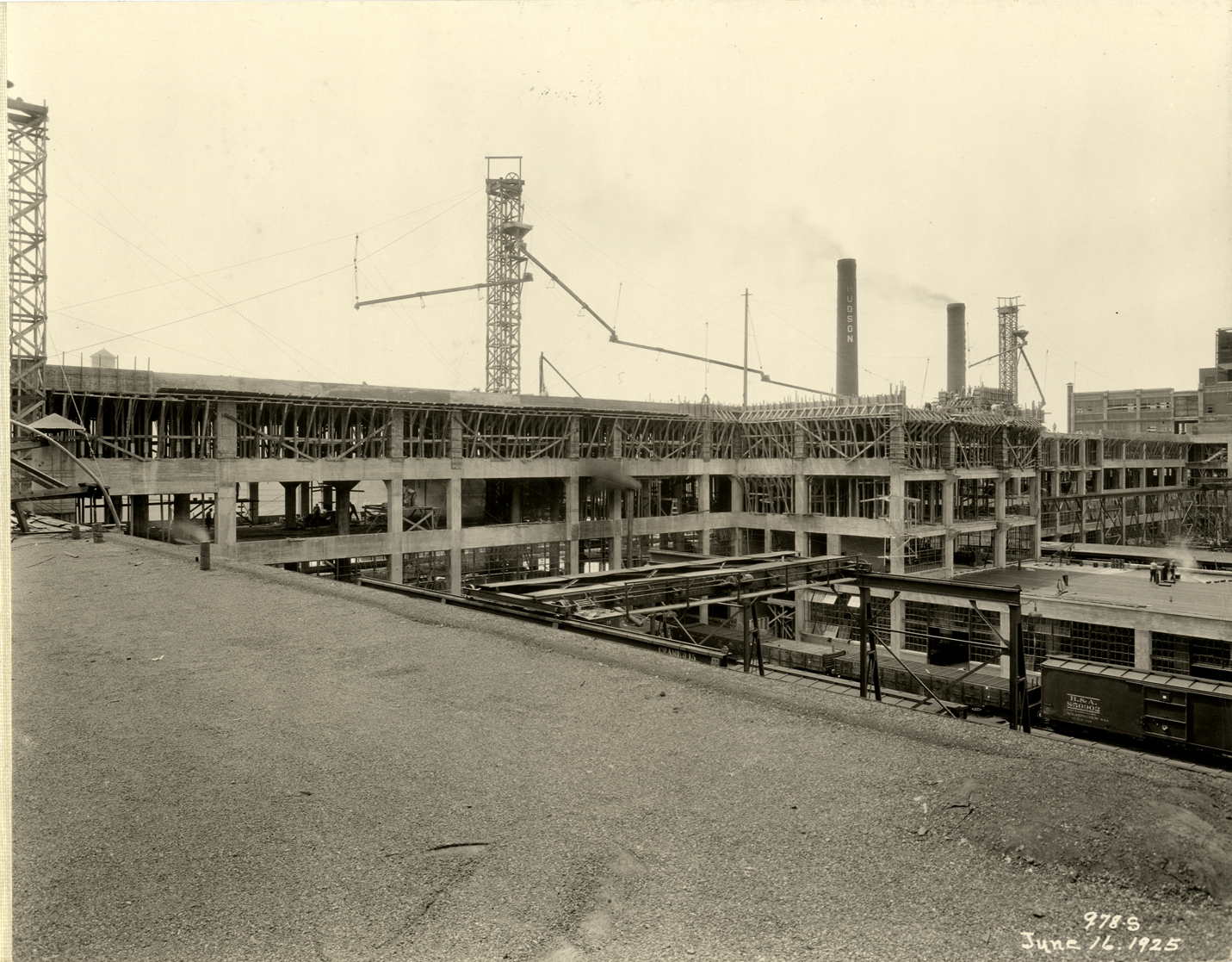 View of the Hudson Motor Car Company factory during construction. Printed on front: "978-S. June 16, 1925." Handwritten on back: "6/16/25. Showing new Connors [sic] Ave. bldg. under construction. Factories--Hudson."