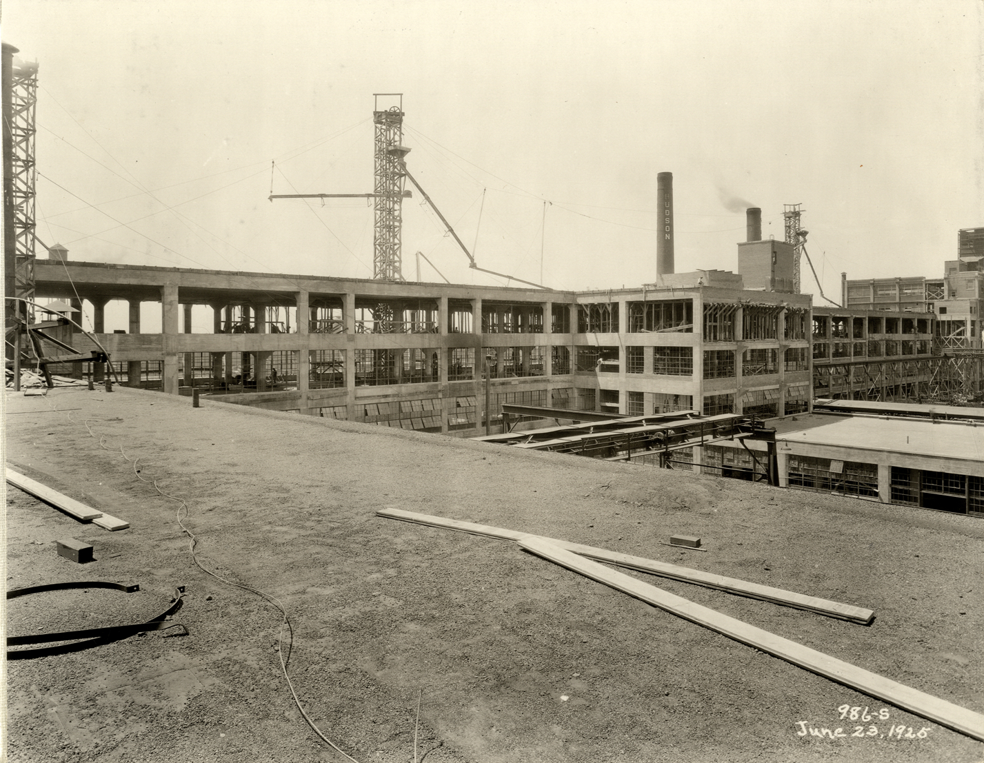 View of the Hudson Motor Car Company factory during construction. Printed on front: "986-S. June 23, 1925." Handwritten on back: "6/23/25. Showing new Connors [sic] Ave. bldg. under construction. Factories--Hudson."