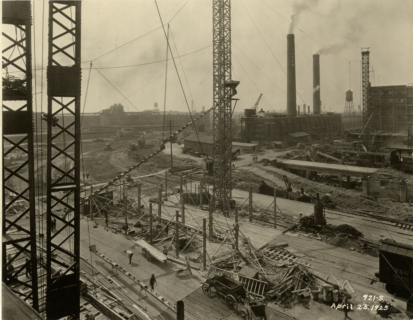 View of the Hudson Motor Car Company factory during construction. Printed on front: "921-S. April 23, 1925." Stamped on back: "Frank H. Stone, commercial photographer. Hickory 5131, 3449 Garland, Detroit, Michigan." Handwritten on back: "April 23/25. Showing new Connors [sic] Ave. bldg. under construction. Factories--Hudson."