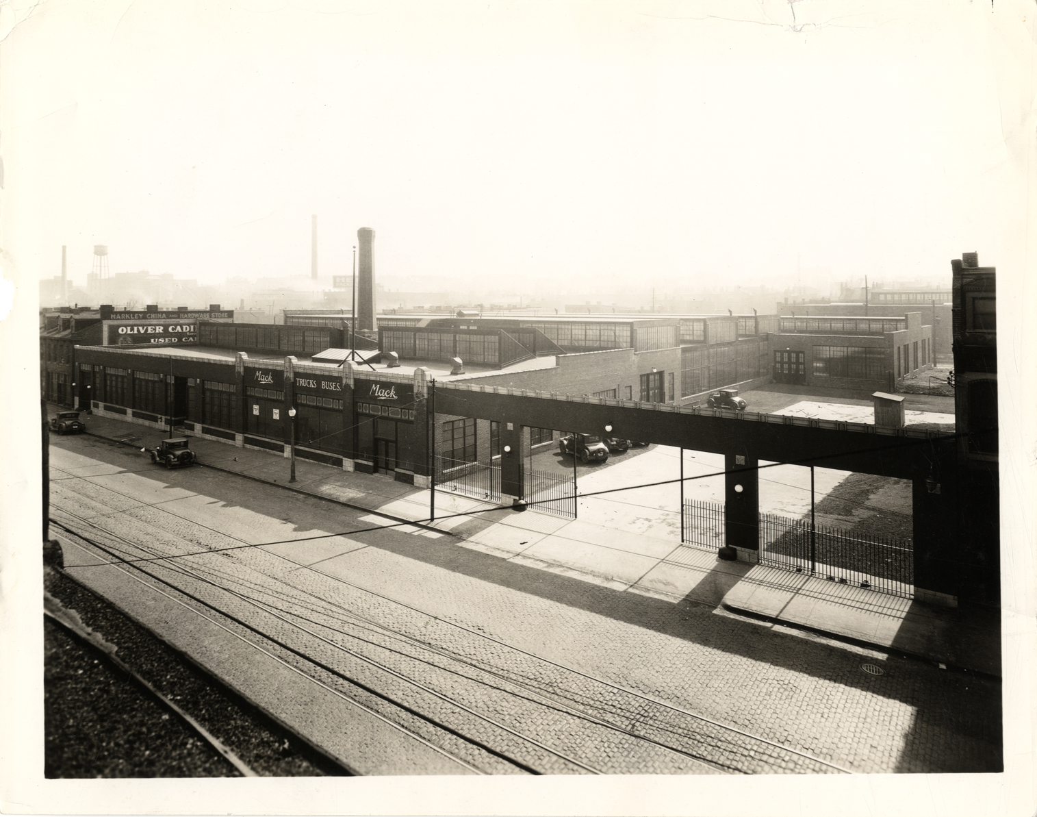 View of the Mack Trucks factory. Stamped on back: "Commercial Photo Co., 506-7 Oriel Bldg., Chestnut 6209, St. Louis, Mo."