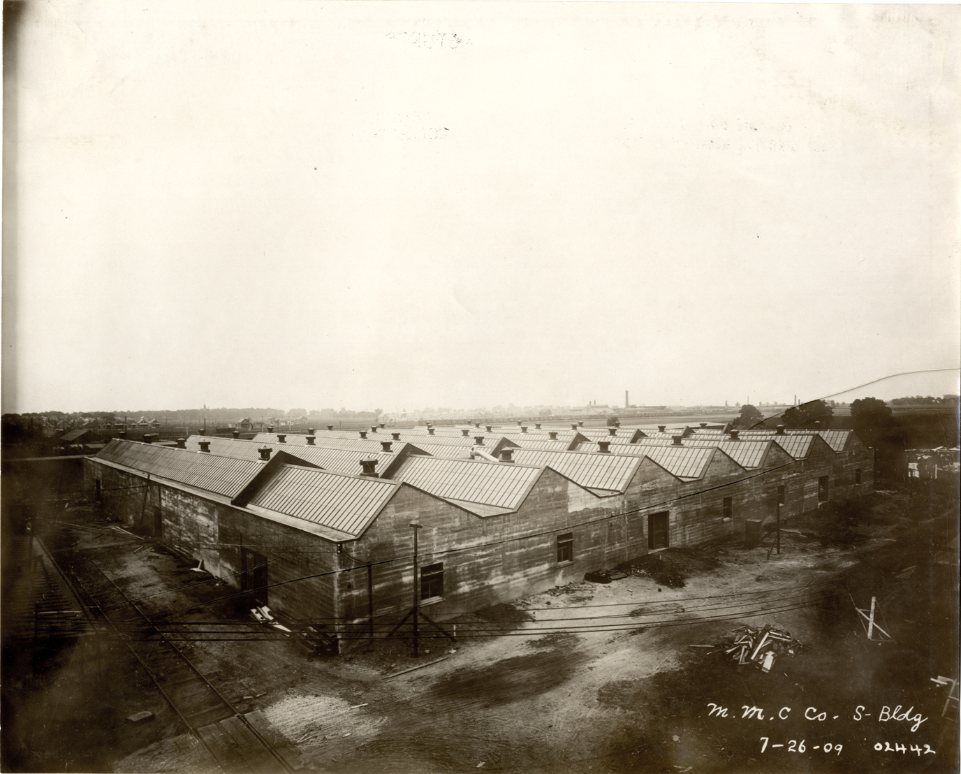 View of the Mitchell Motor Car Company factory in Racine, Wisconsin. Printed on front: "M. M. C. Co. S-bldg., 7-26-09." Handwritten on back: "Factories--Mitchell Motor Car Co., Racine."