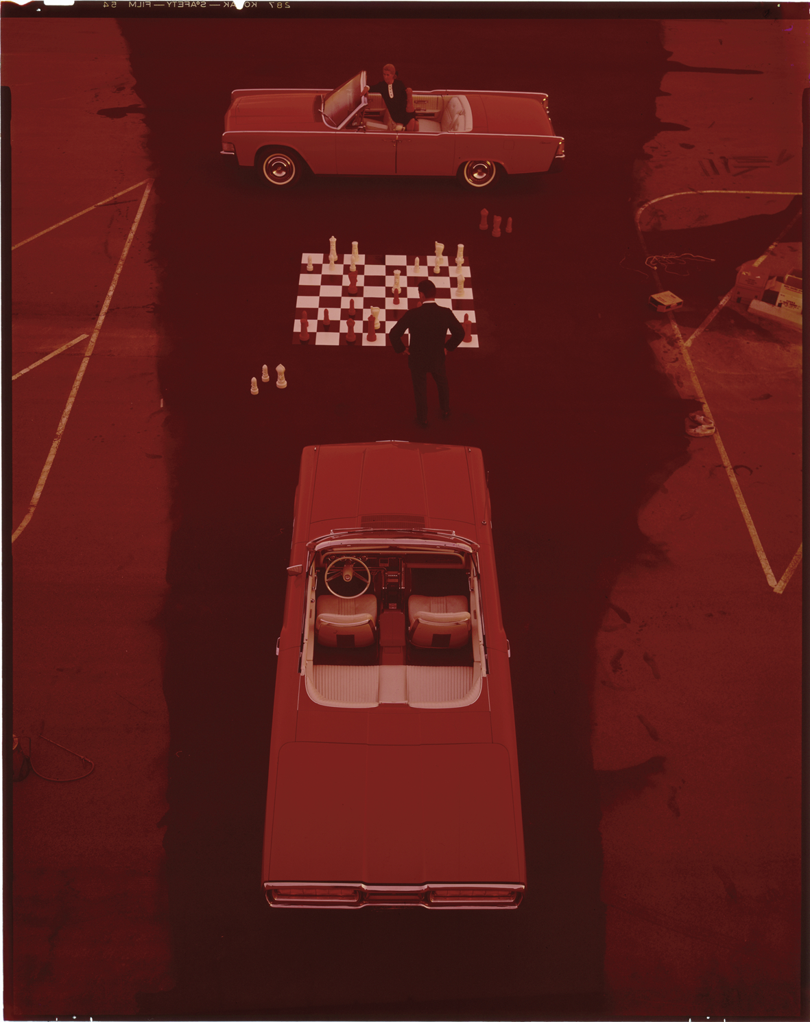 View of two 1965 Lincoln Continetal convertibles. Man stands in front of chess set between the cars; woman poses in car in background. Label on sleeve: "Ford Motor Co., Ford Lincoln, 1965."