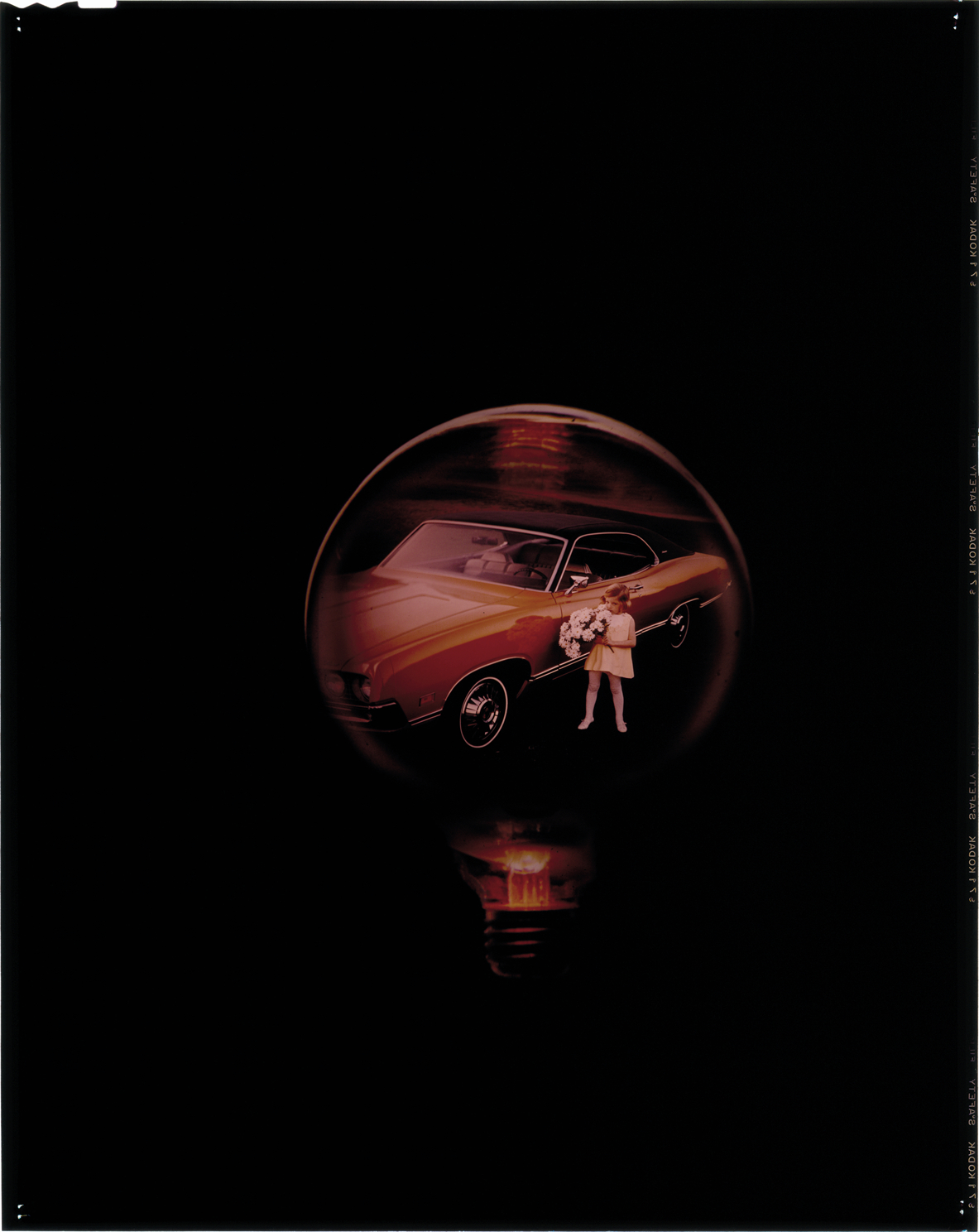 View of a young girl, holding a bunch of daisies, posing with a Ford coupe. Image is superimposed over a lightbulb. Label on sleeve: "Ford Motor Co., Ford advertising, 1970s."