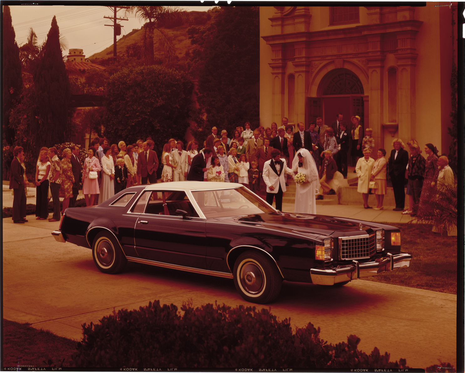 View of a Ford coupe parked in front of a church. Bride, groom and wedding guests in background. Label on sleeve: "Ford Motor Co., Ford, 1977-78."