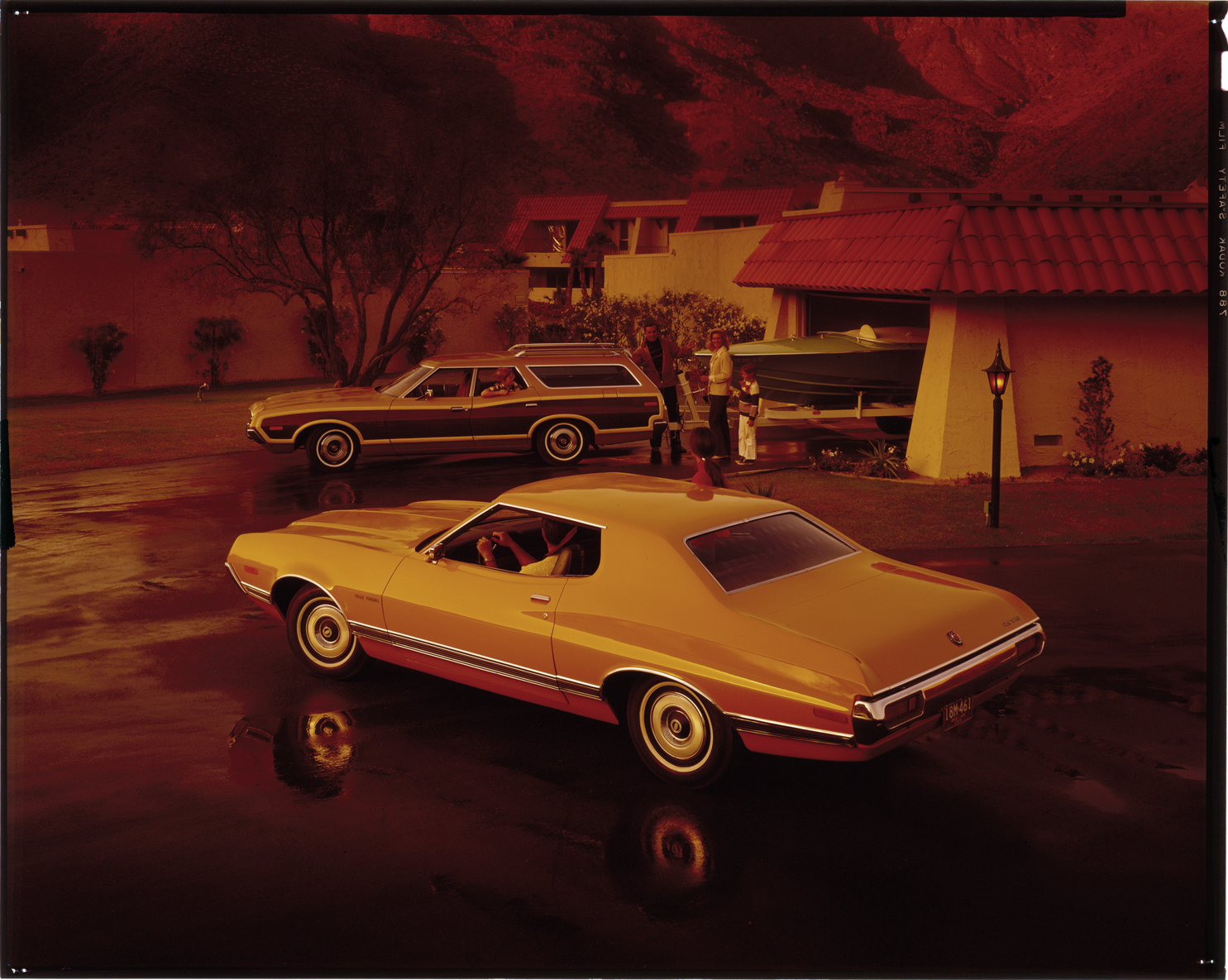 View of a 1972 Ford Torino coupe and a 1972 Ford Torino station wagon. Boat on trailer is hitched to station wagon. Label on sleeve: "Ford Motor Co., Ford Torino, 1972."