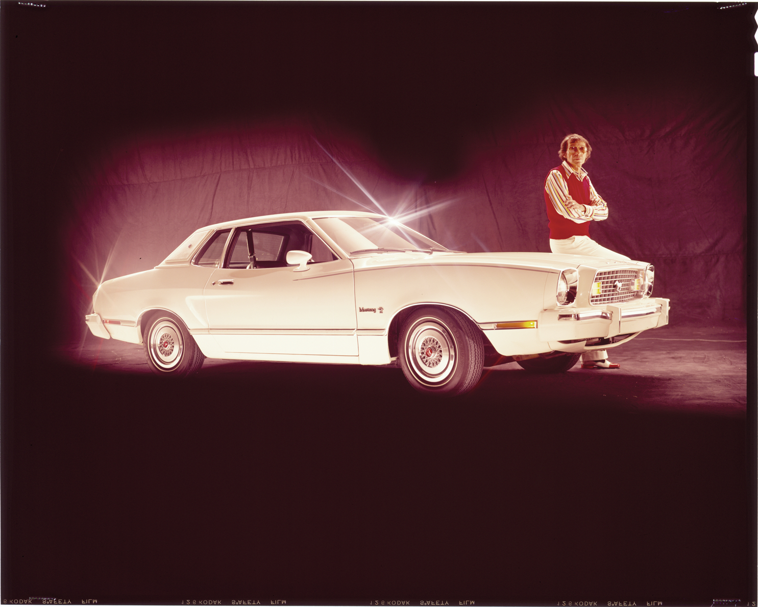 View of a man posing with a Ford Mustang coupe. Label on sleeve: "Ford Motor Co., Ford Mustang, 1974-1976."