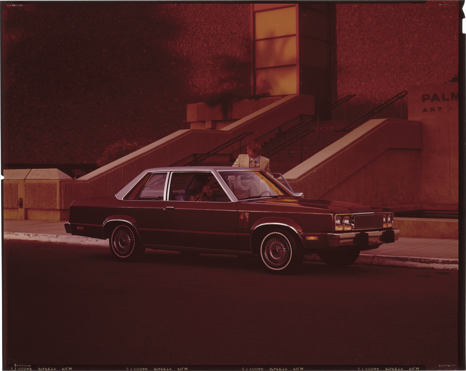 View of a man and woman posing with a Ford Fairmont coupe. Label on sleeve: "Ford Motor Co., Ford Fairmont, 1978-80."
