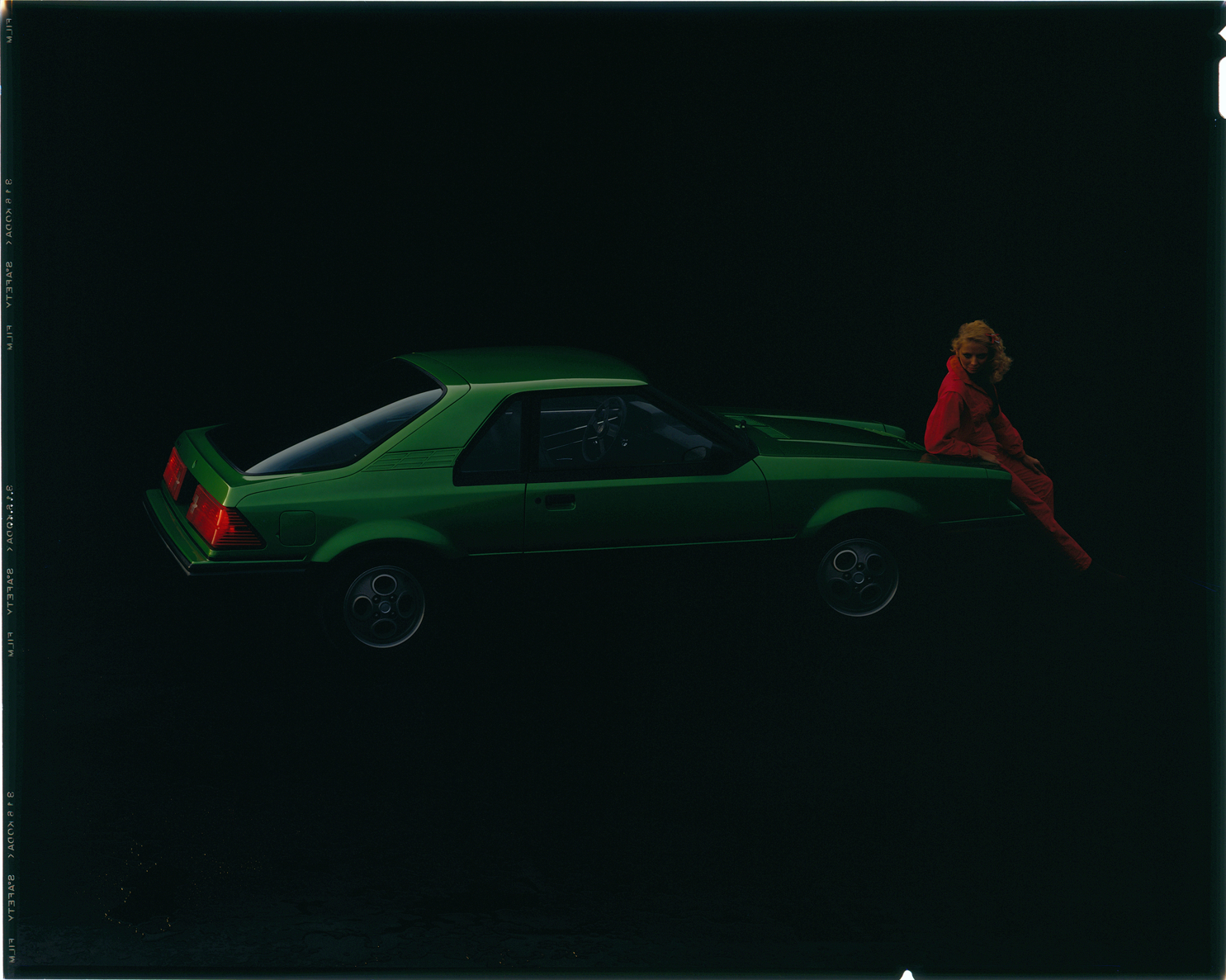 View of a woman posing with a Ford EXP coupe. Label on sleeve: "Ford Motor Co., Ford EXP, 1982-88."
