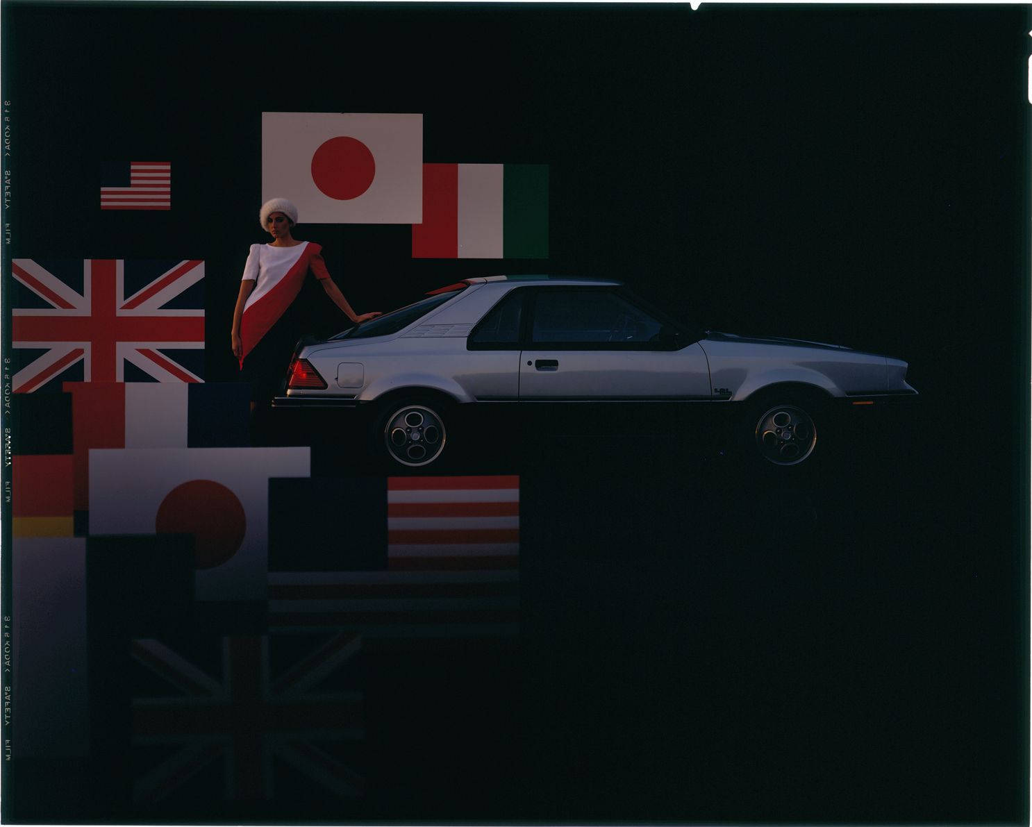 View of a woman posing with a Ford EXP coupe. Flags in background. Label on sleeve: "Ford Motor Co., Ford EXP, 1982-88."