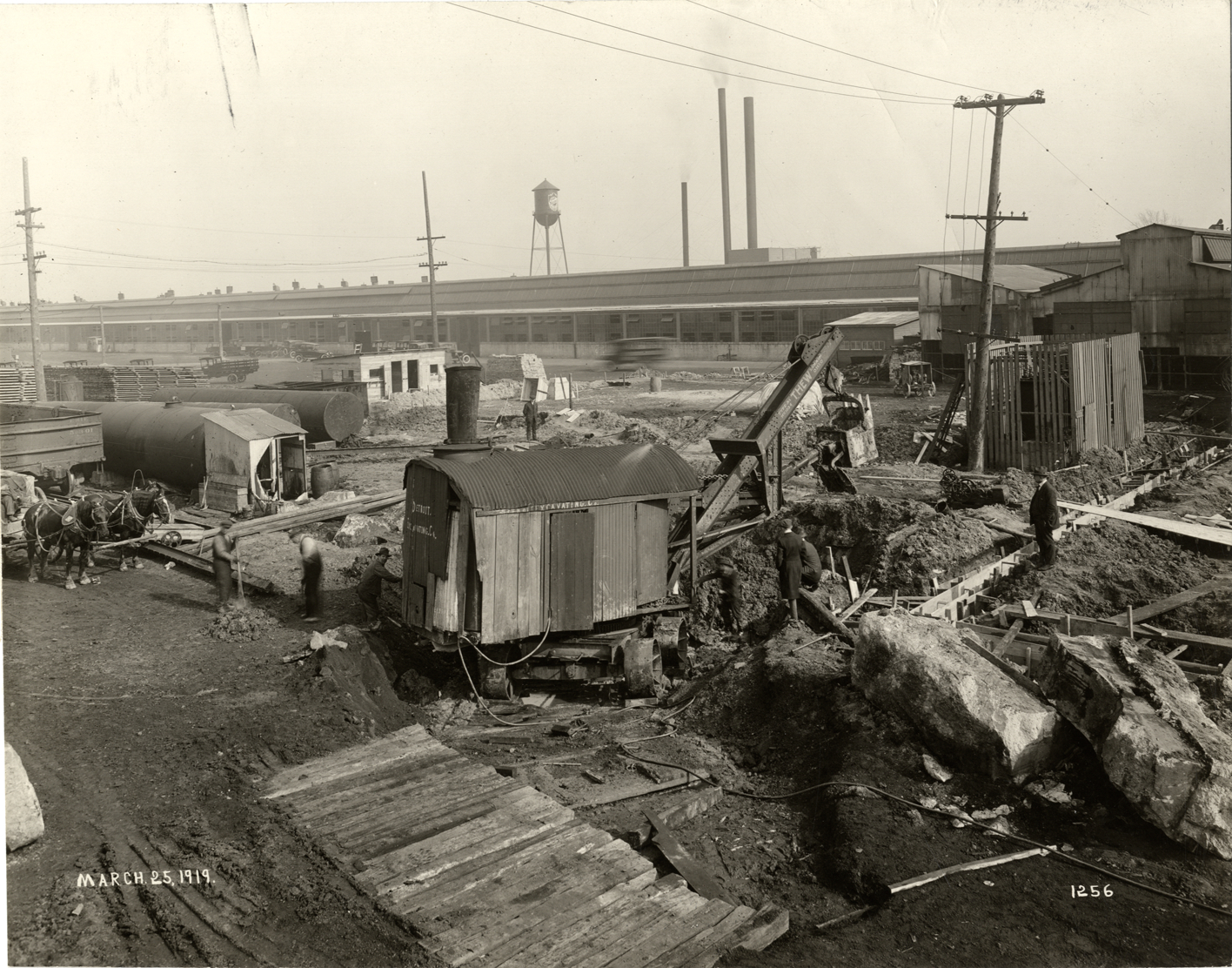 View of workers with a Detroit Excavating Co. steam shovel digging the foundation of the Maxwell Motor Company factory. Printed on front: "March 25, 1919." Handwritten on back: "Factories--Maxwell."
