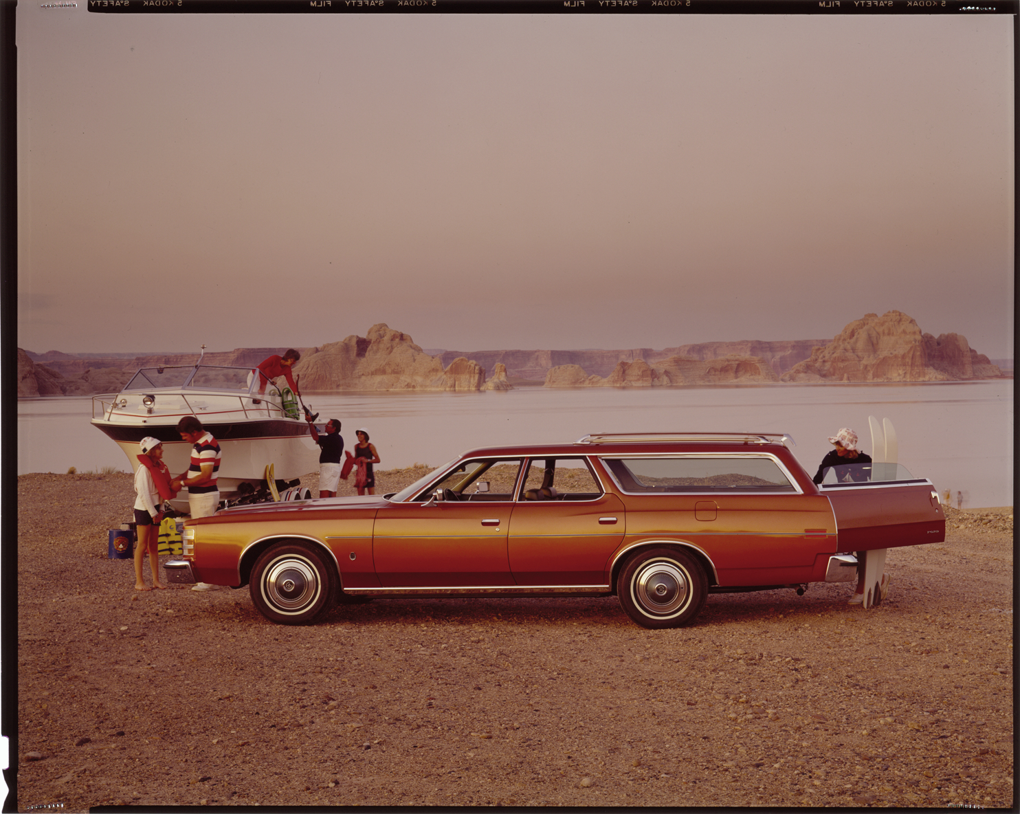 View of men and women posing with a Ford station wagon. Motorboat on trailer on left; lake in background. Label on sleeve: "Ford Motor Co., Ford wagon, 1973-74."