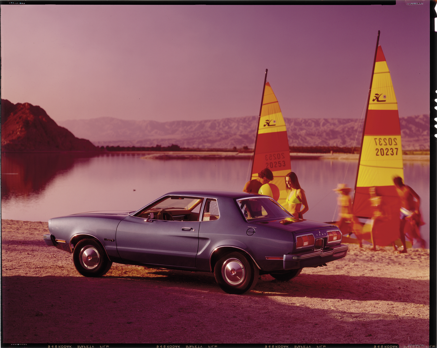 View of a Ford Mustang coupe. Men and women with sailboats in background. Label on sleeve: "Ford Motor Co., Ford Mustang, 1974-75."