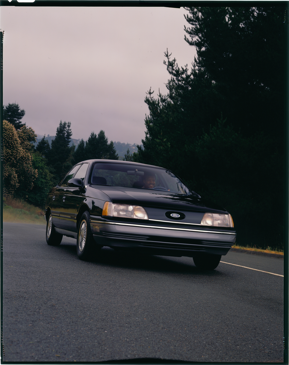 View of a man driving a Ford Taurus sedan. Label on sleeve: "Ford Motor Co., Ford Taurus, 1985-89."